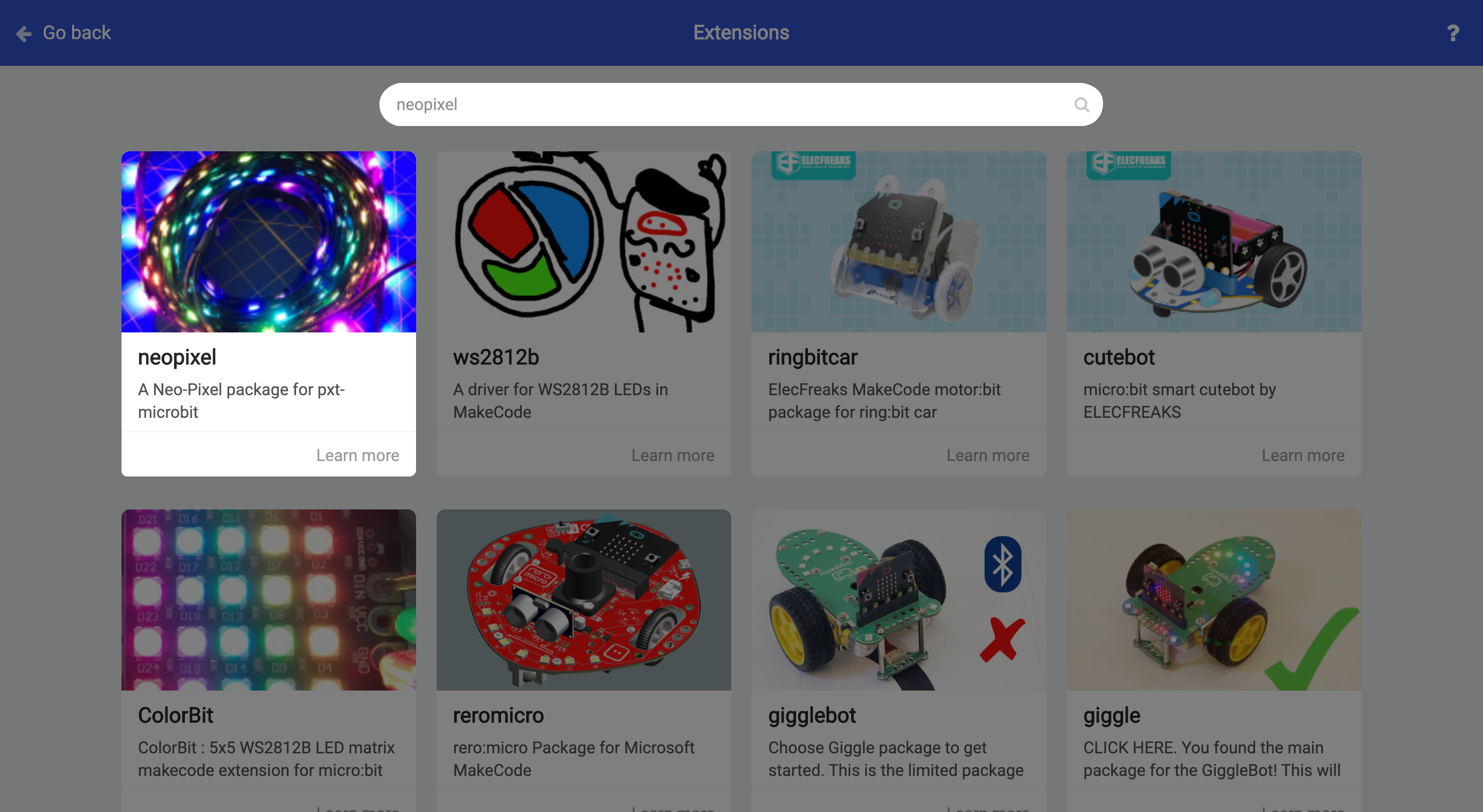 (c) Search for “neopixel”, and select the “neopixel” extension. This will allow us to control the 4 Neopixel strips.