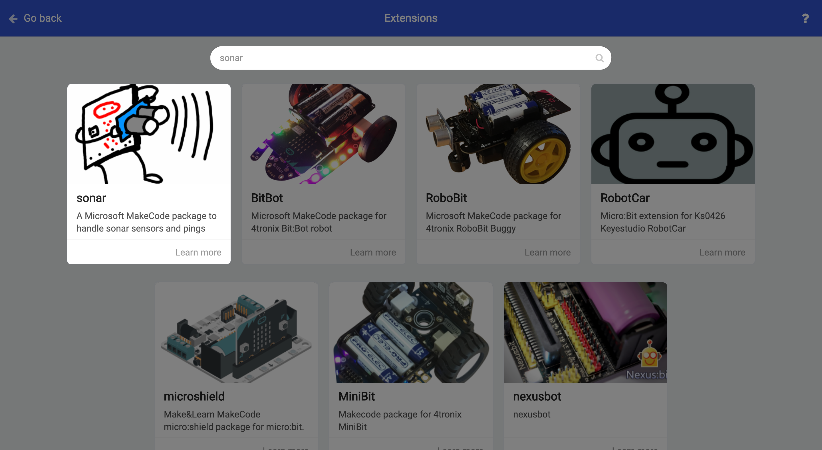 (d) Search for “sonar”, and select the “Sonar” extension. This will allow us to control the HC-SR04 sensor.