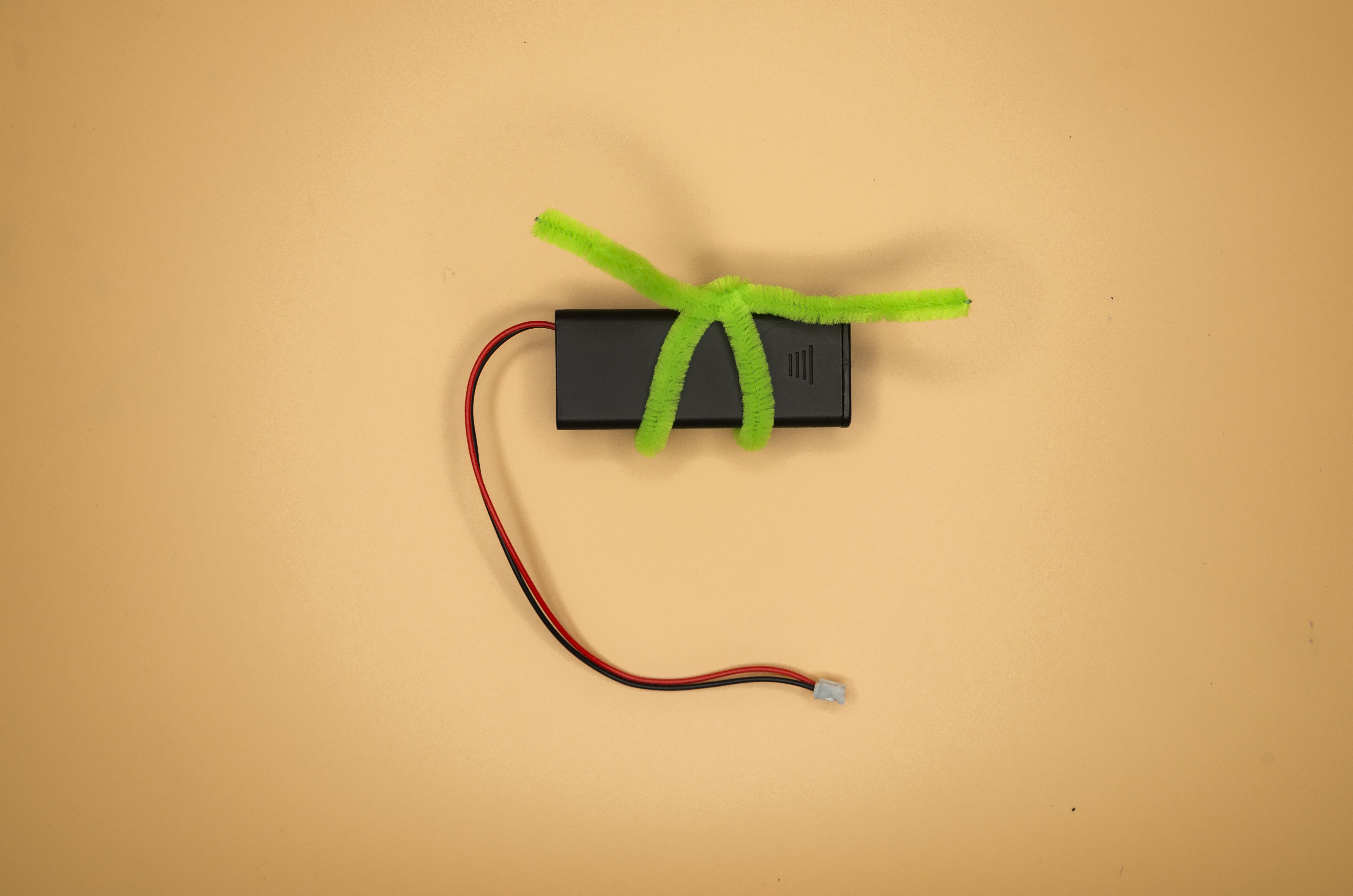 Attach the battery holder onto the top of the metal frame using the pipe cleaner.