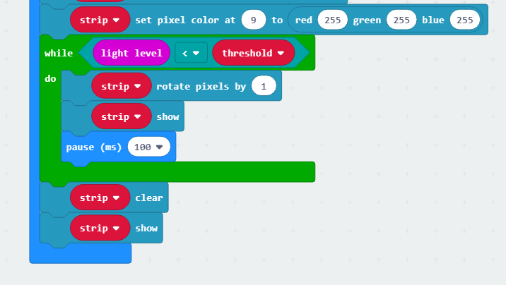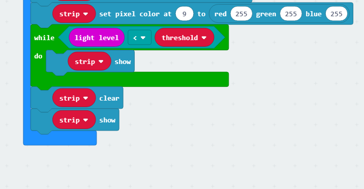 Use a while loop (Loops) and a comparison block (Logic) to show all the lights in their set positions. Once the light level drops below the threshold value, the strip will show!