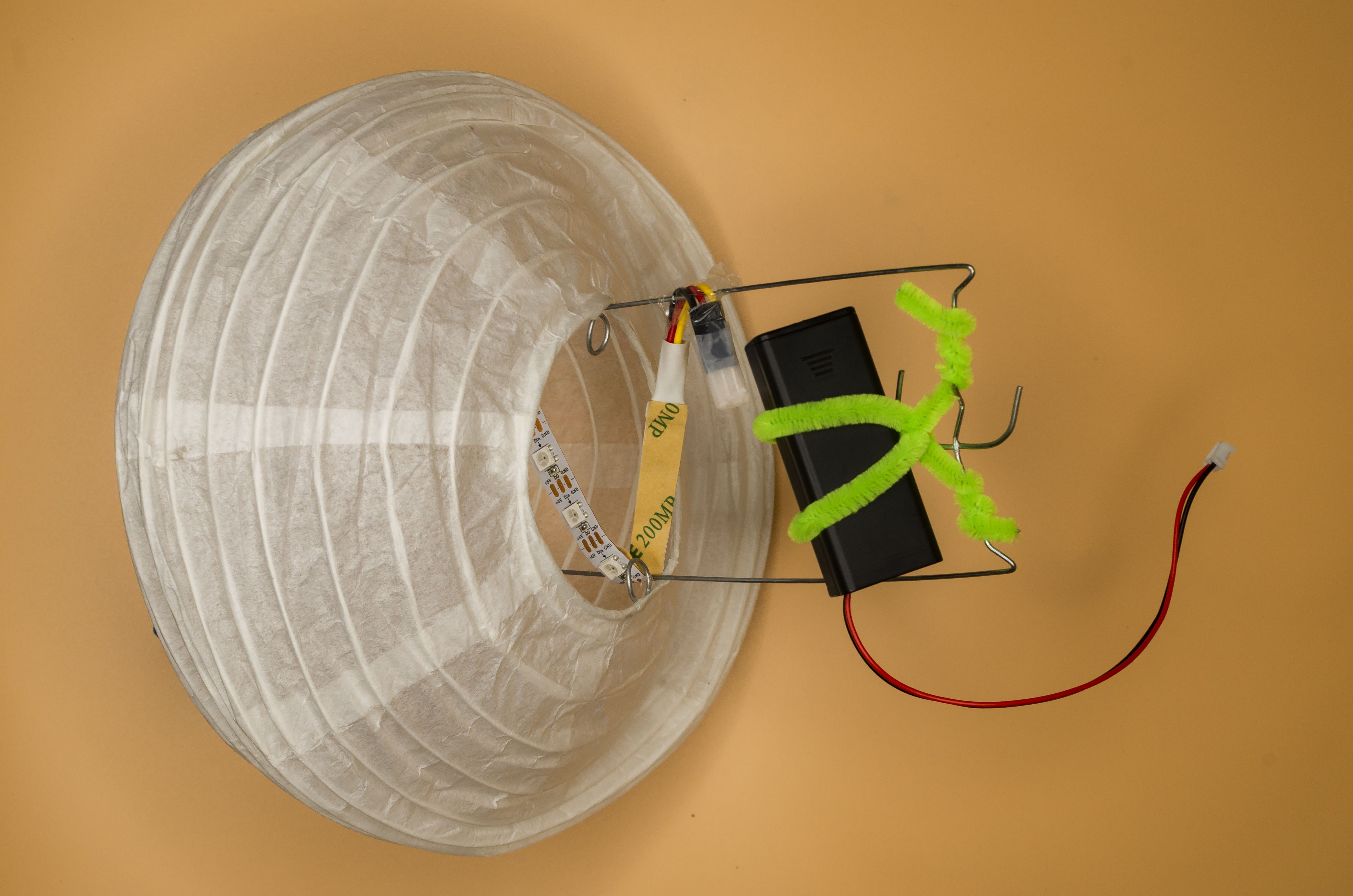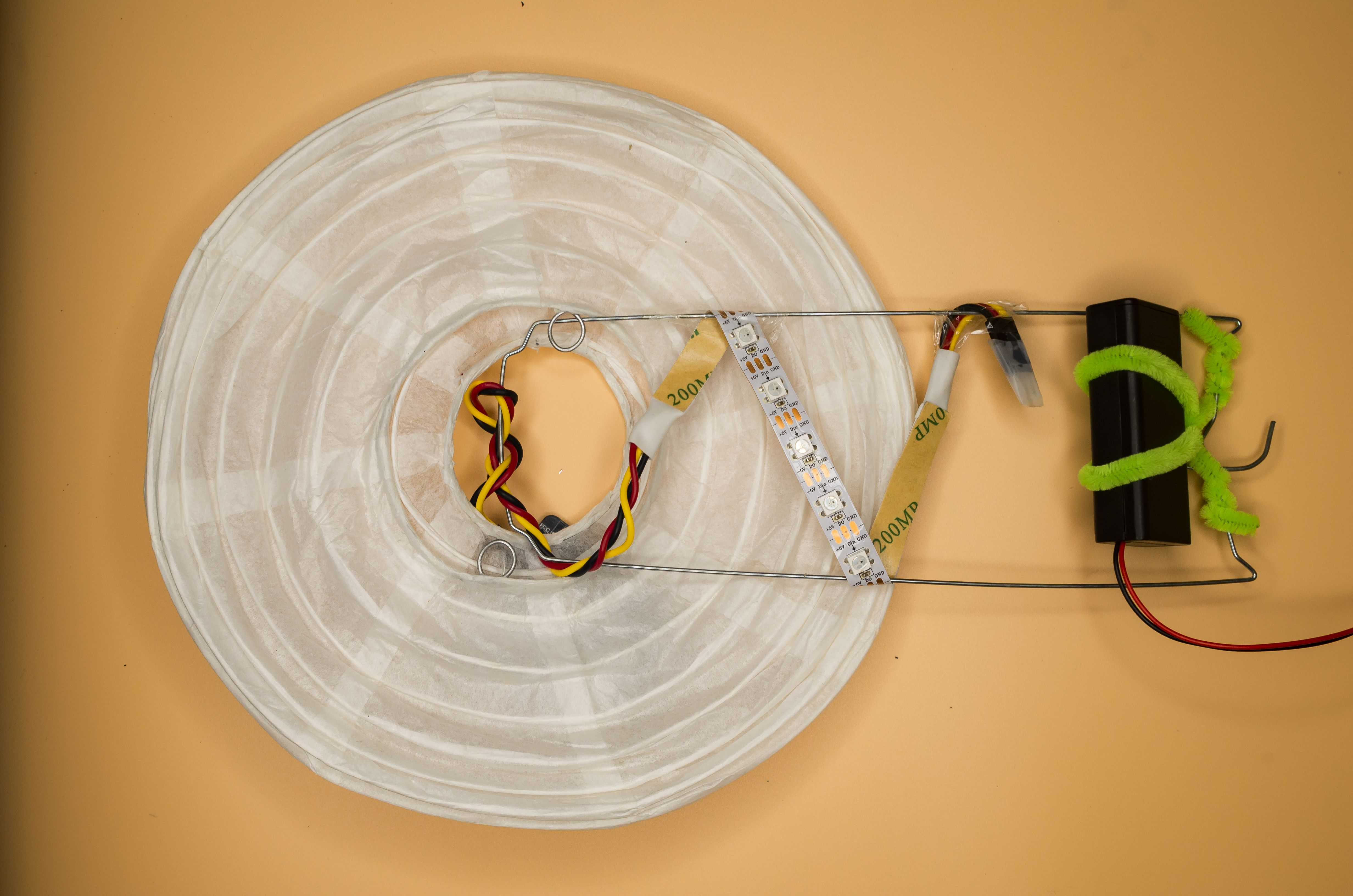 Coil the LED strip around the metal frame of the lantern as shown in the picture. Tape the LED strip near the top of the metal frame to secure it.