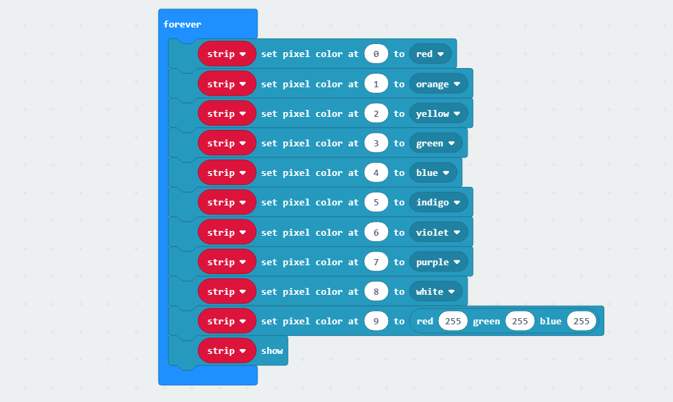 In a forever block, set each pixel to a different colour to make a rainbow. (Find this block in the ... more drawer of the Neopixel drawer)