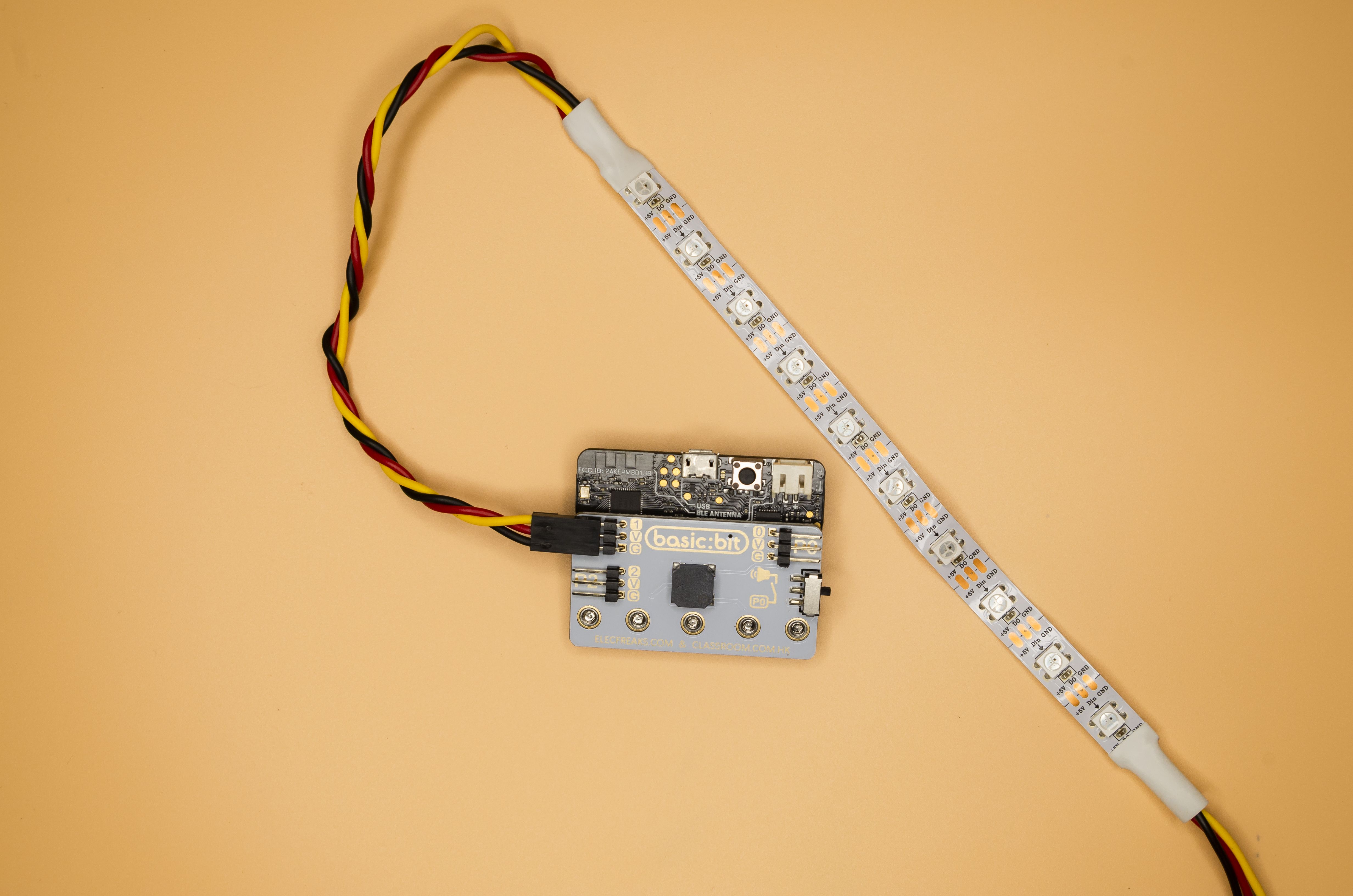 Connect the Neopixel LED Strip to Pin 1 on the basic:bit. Ensure that the black wire is connected to “G” and the red wire to connected to “V”.