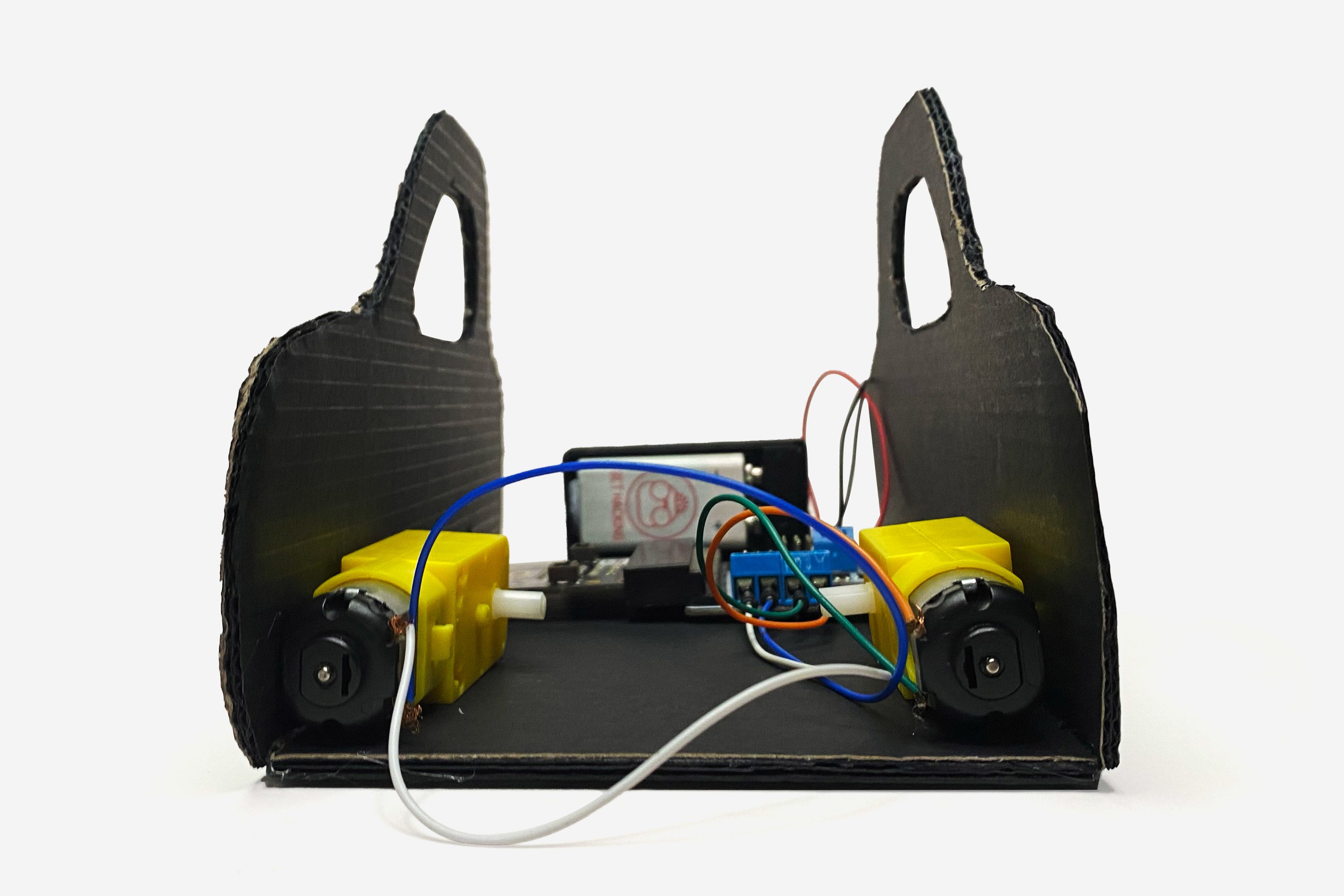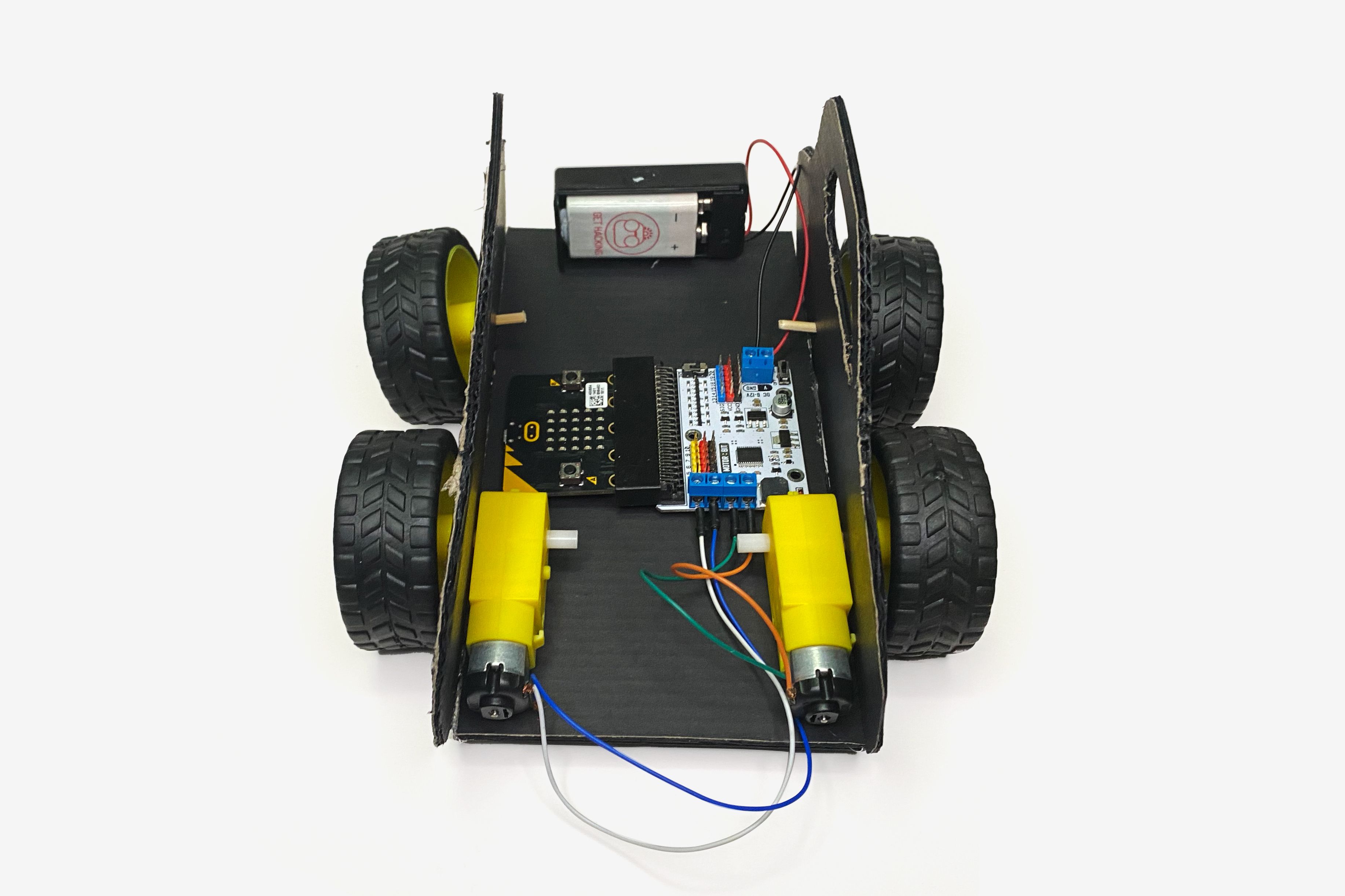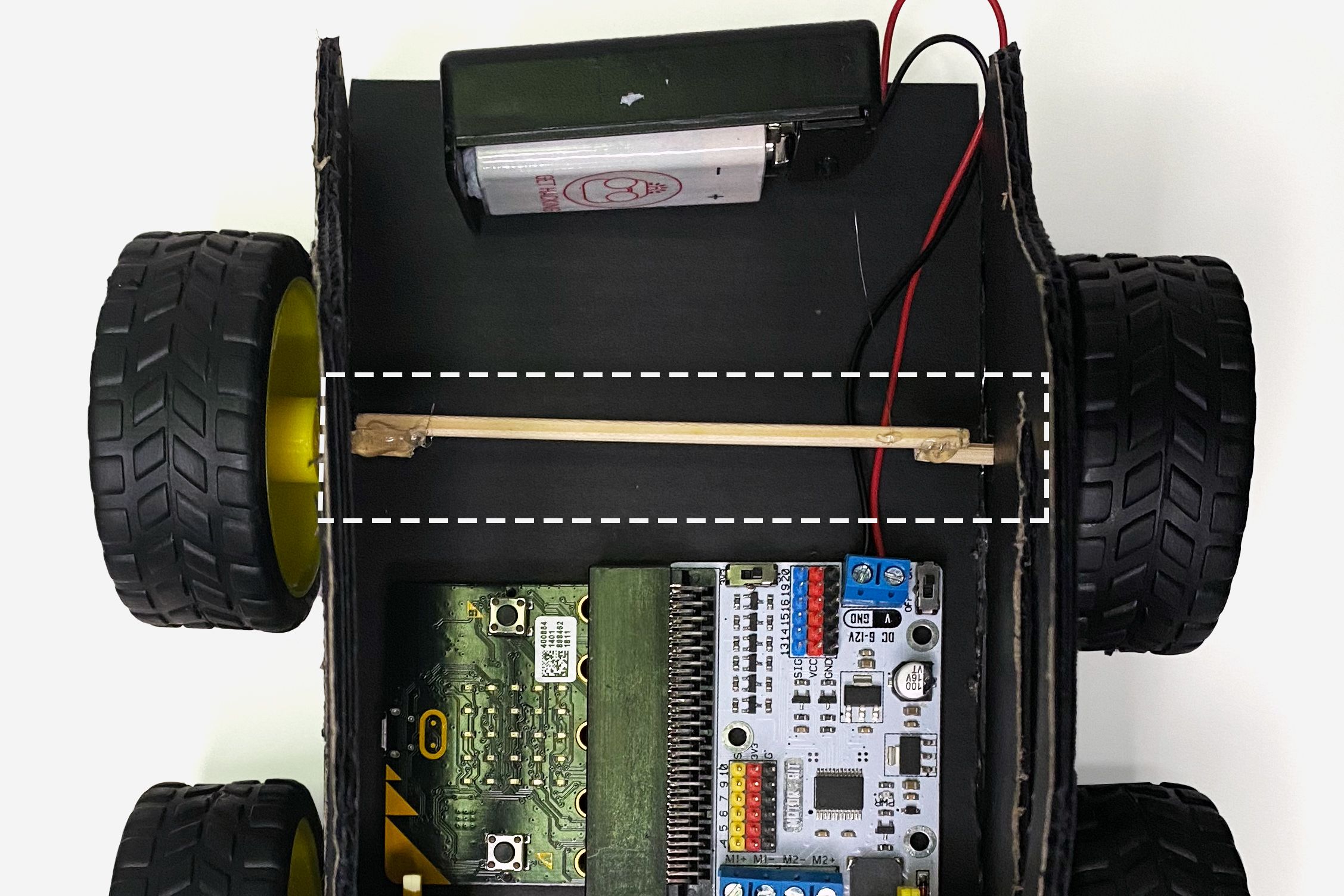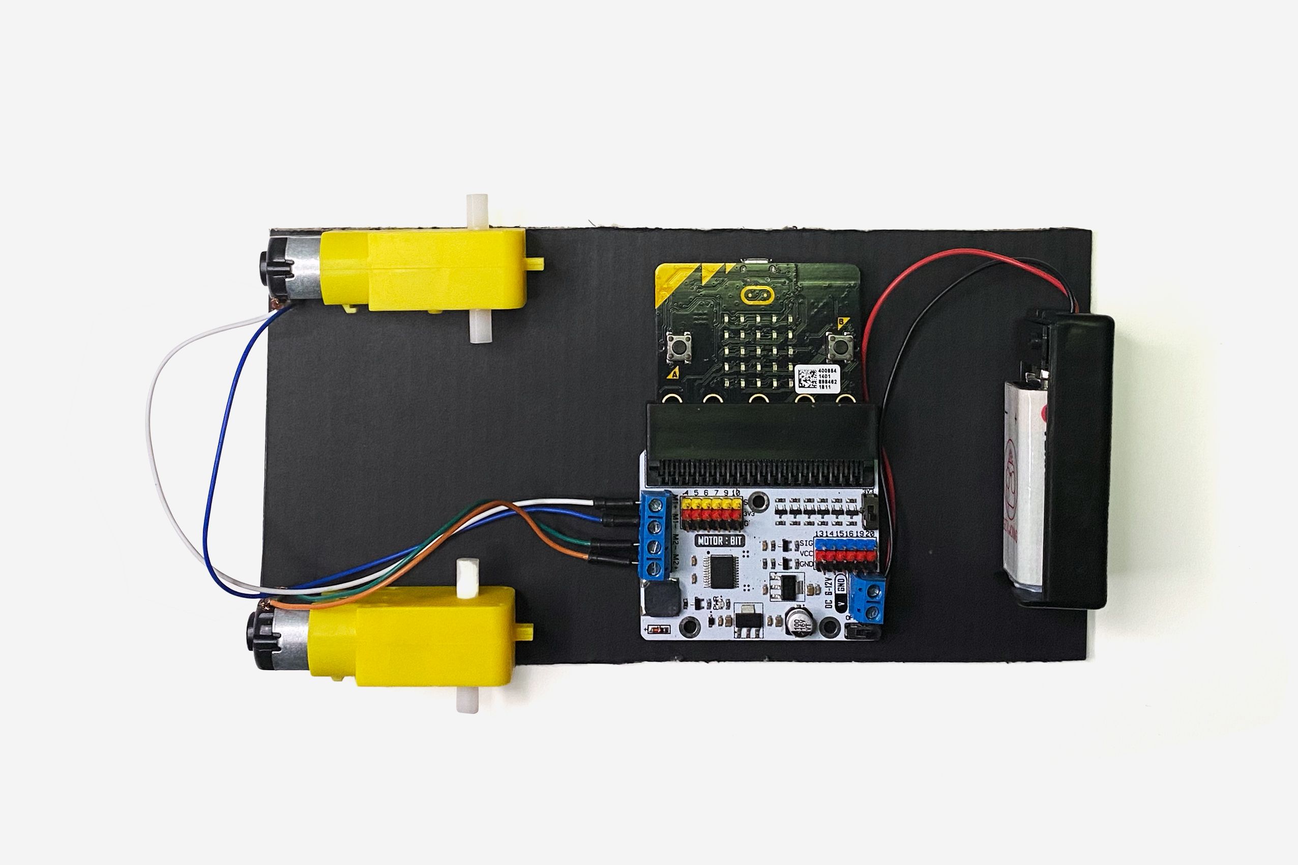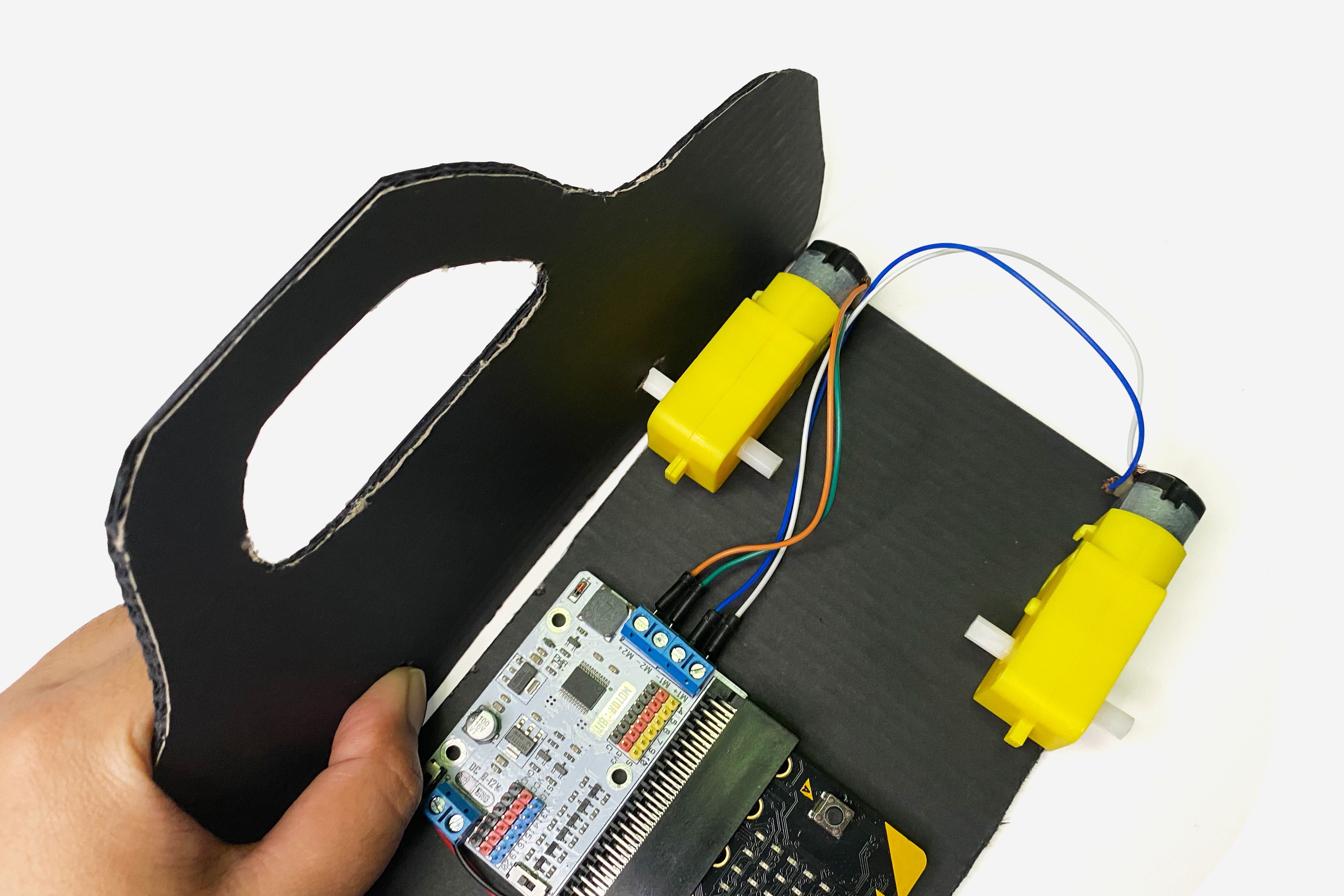 Next, attach the TT motors, motor:bit, micro:bit, and battery pack on the third piece of cardboard with Blu Tack. We will use hot glue to secure these components later on, once we finalise their position.