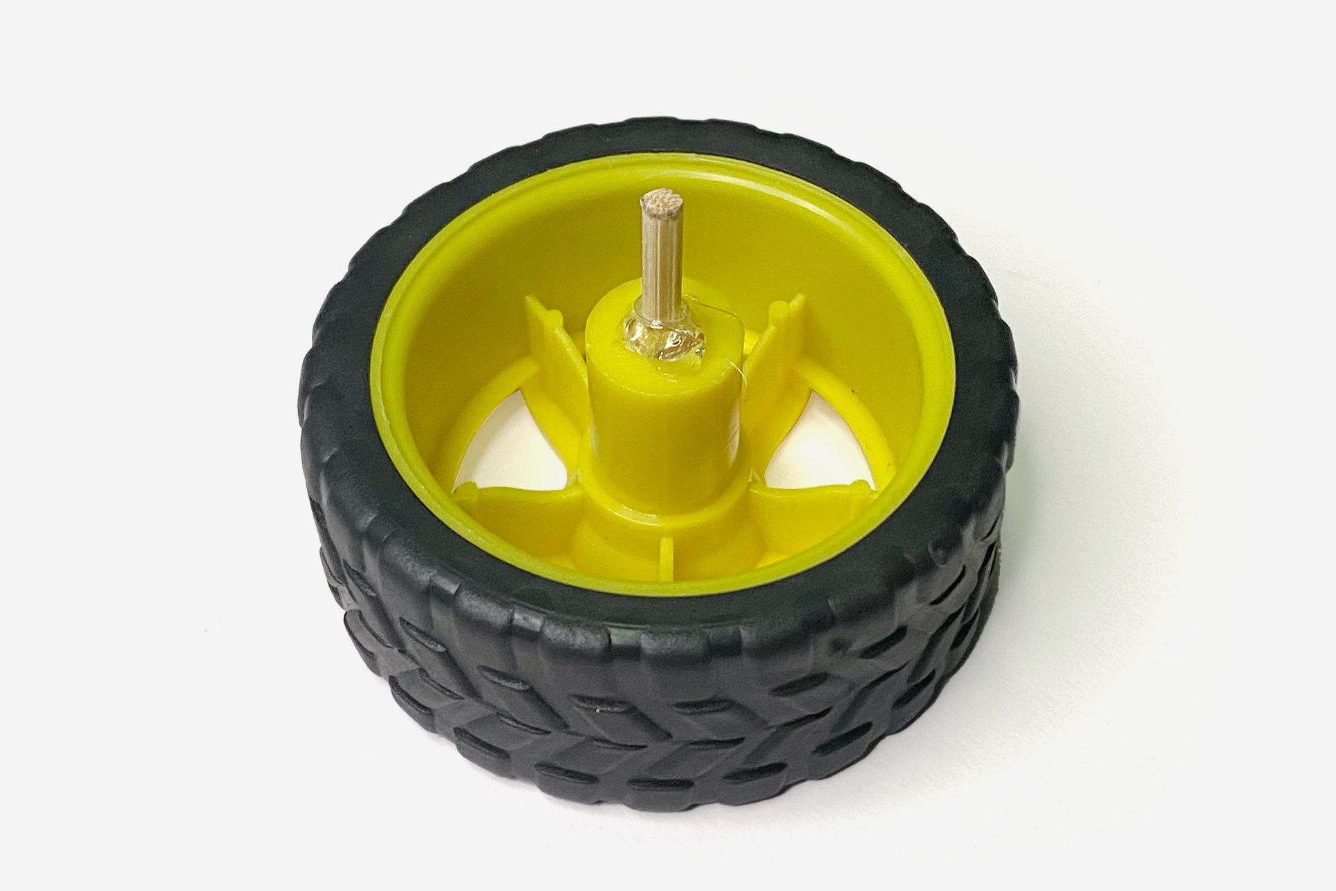 Insert one of the 4cm sticks into the wheel. Use hot glue to secure them. Do the same for another wheel.