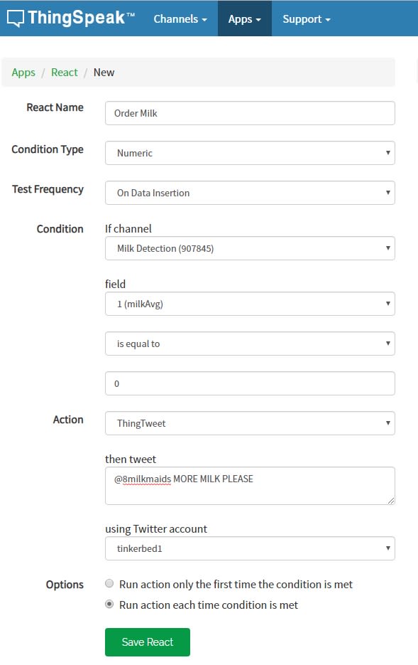 If you already have one, connect it to the ThingTweet app, then use the React App in ThingSpeak to start sending a tweet with your connected twitter account every time the milk bottle has been empty for too long.