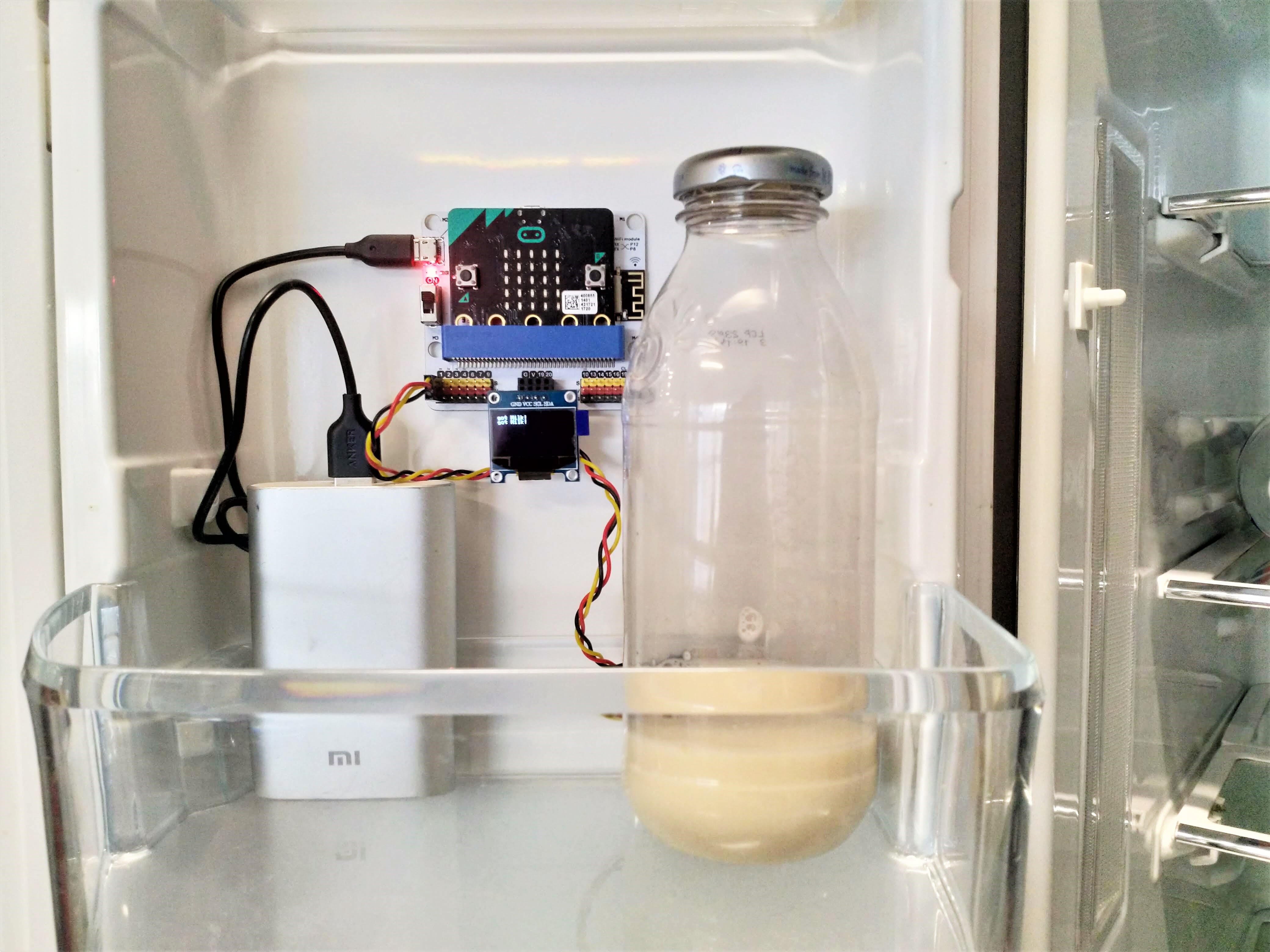 Power up your IoT:bit with a battery pack and secure it where you can see it in the fridge. Place your milk bottle in and start tracking! (Or tweeting at milkmaids)