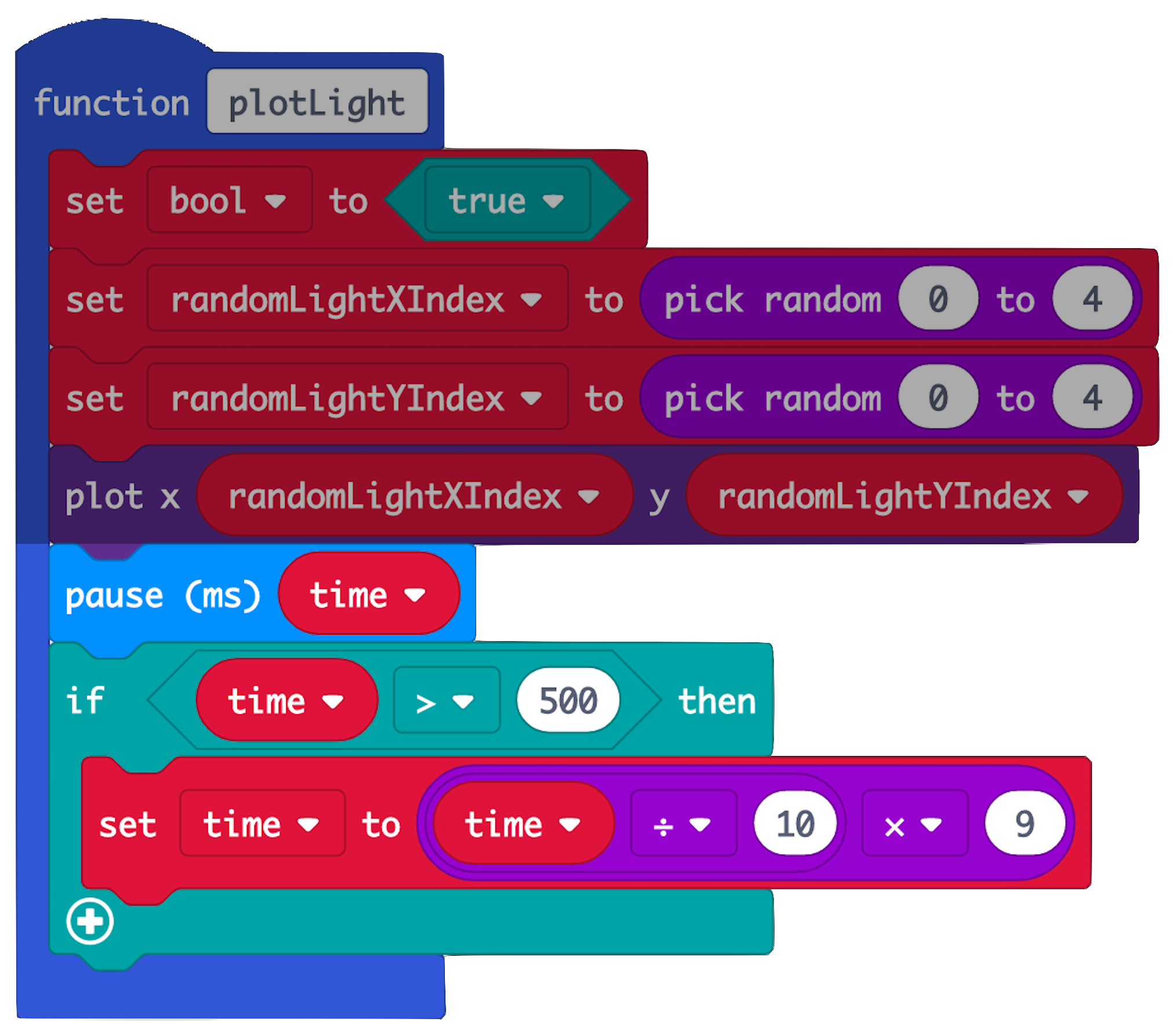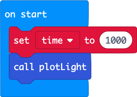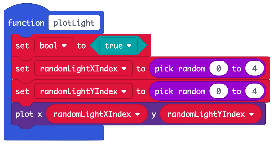 • Create variables 'randomLightXIndex' and 'randomLightYIndex'. Plot these random x and y coordinates on the micro:bit LED screen, to light up a random LED. We chose a random integer from 0 to 4 as the LEDs are numbered from 0 to 4 (see picture).