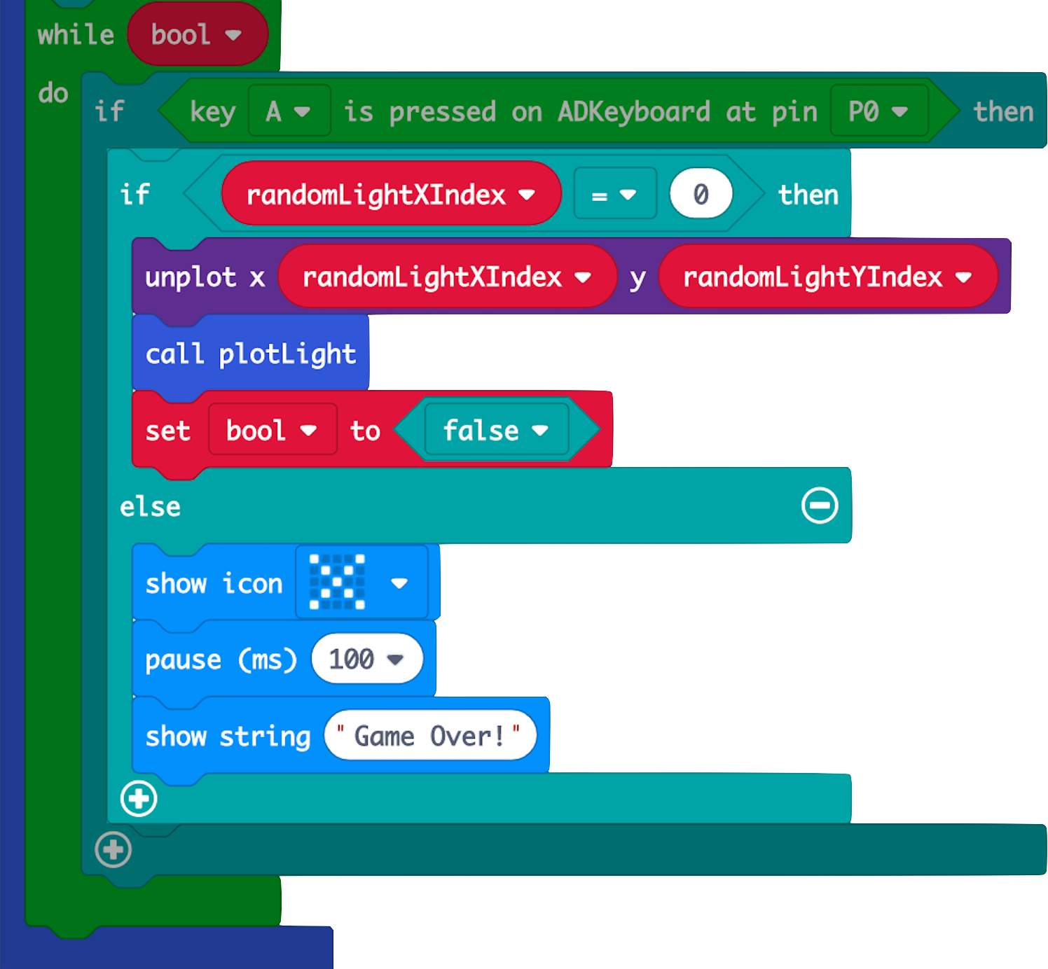 (a) If button A is pressed, check if it corresponds to the column of the lit up LED (ie x-coordinate stored in 'randomLightXIndex').