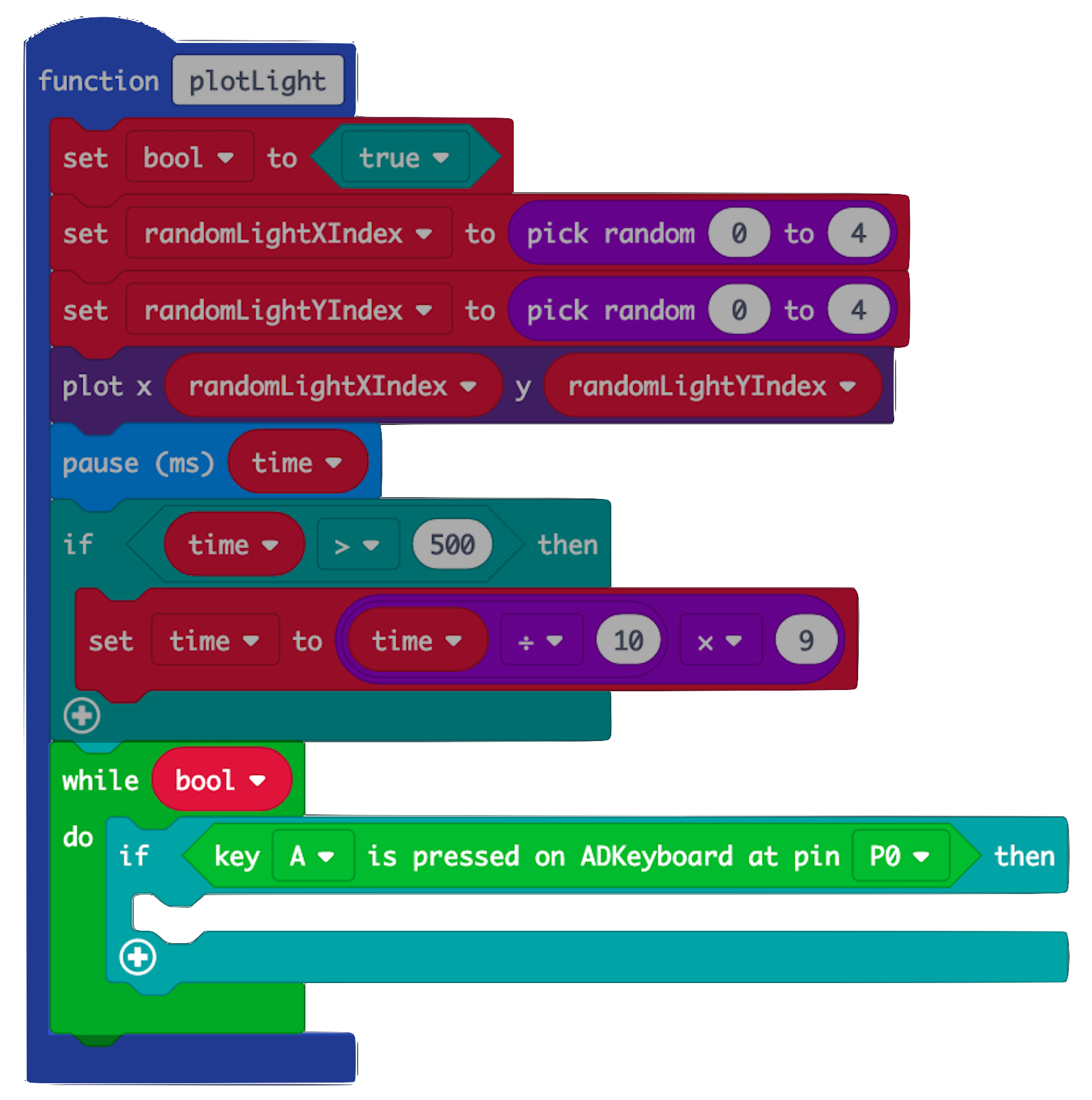 • light up the next random LED by calling 'plotLight', within 'plotLight' - this is recursive programming