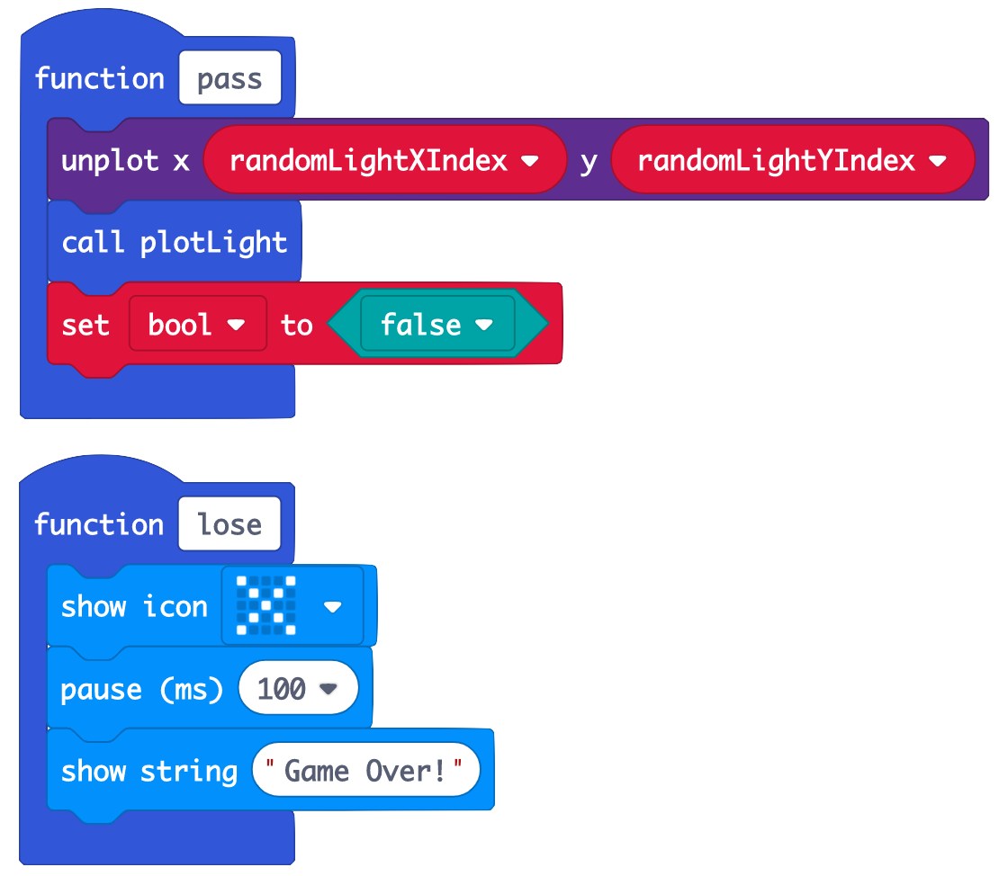 (b) As the code sequence for 6(b) and 6(c) is the same for all 5 buttons, create 2 more functions - 'pass' and 'lose', to store what the program should do when the correct and wrong buttons are pressed respectively.