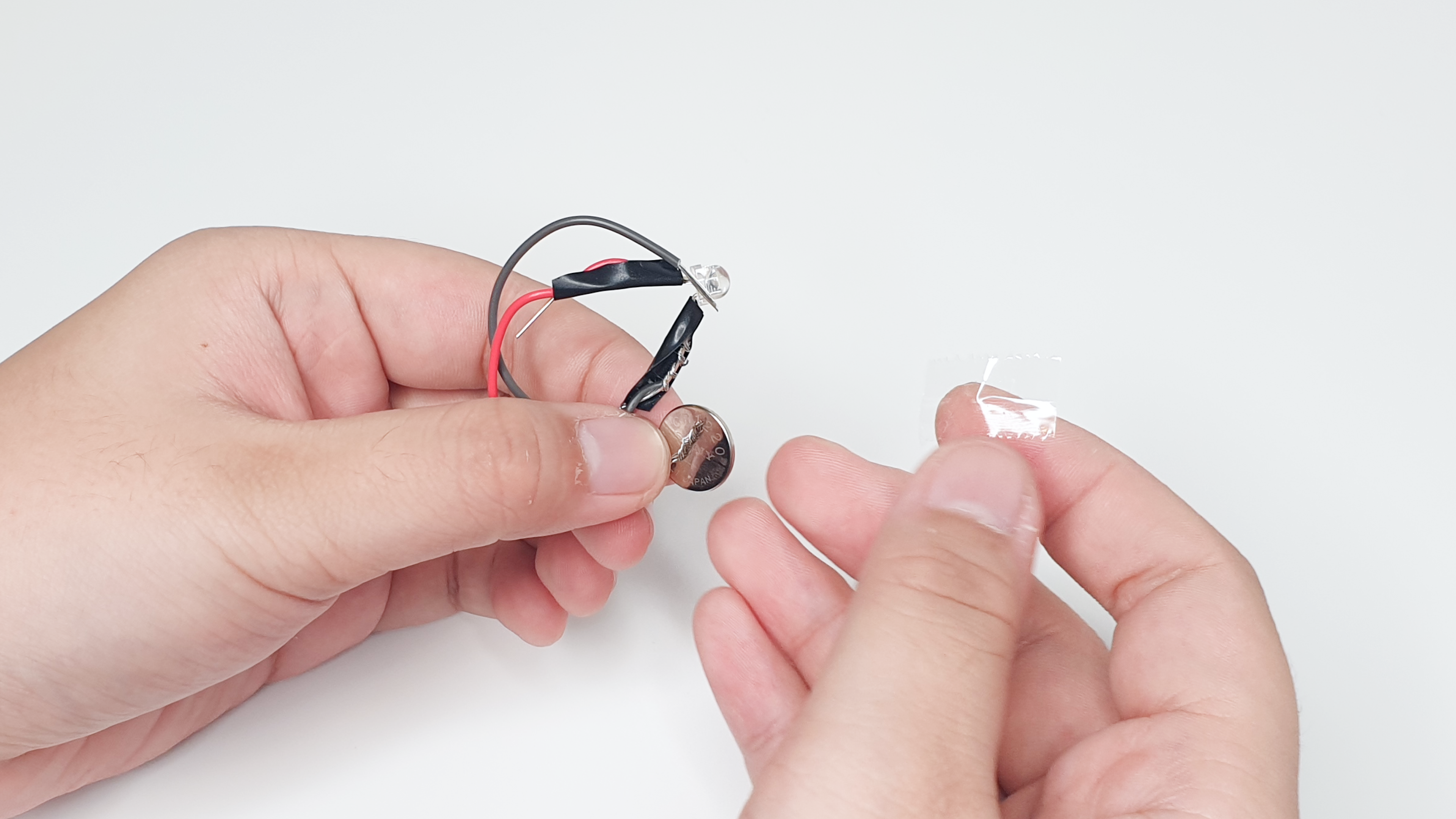 Connect the coin cell to the wires (make sure the polarities are correct!) and secure with scotch tape. Your ring should light up.