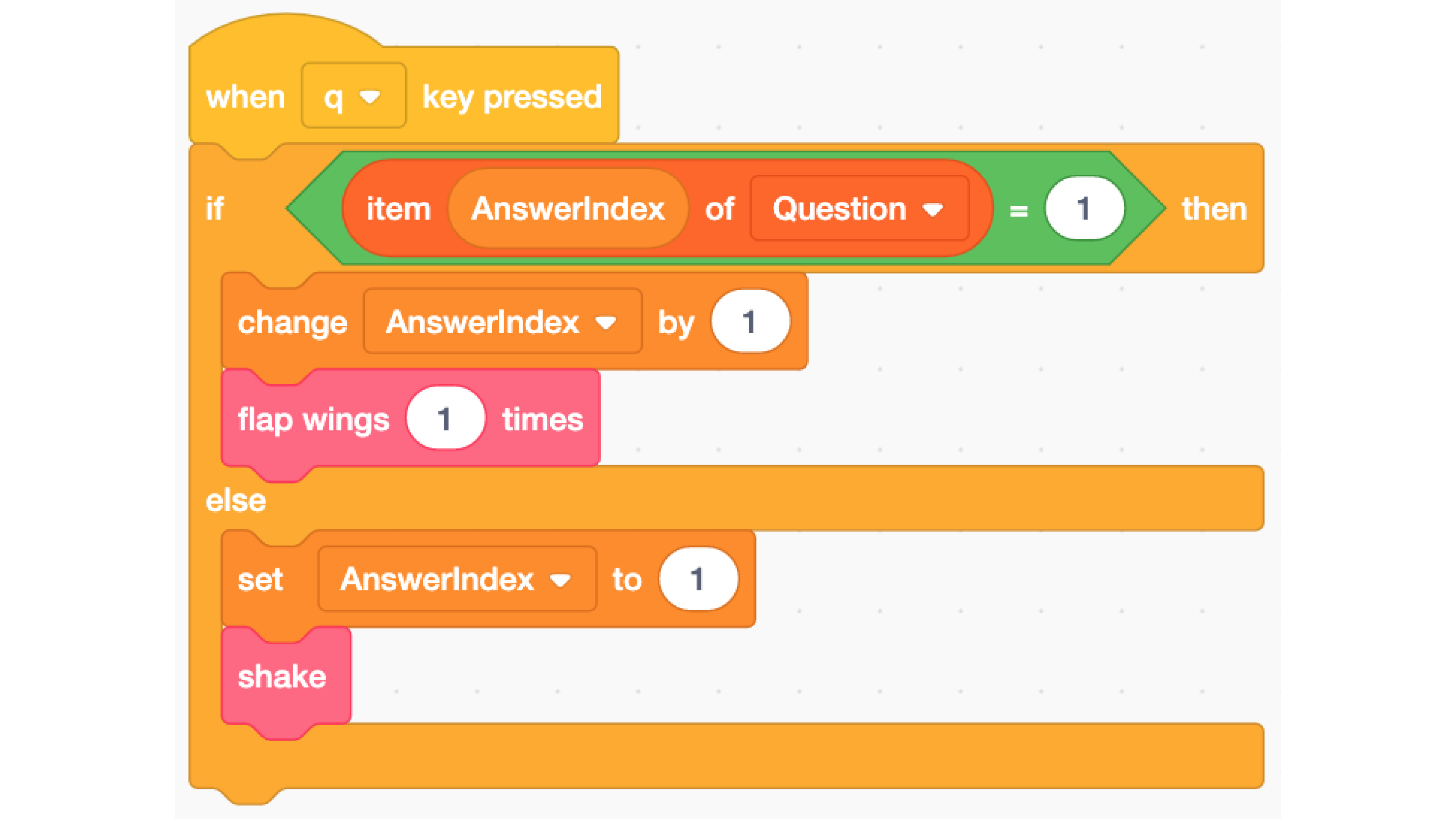 If so, the toucan will flap and AnswerIndex will increase by 1 (one more point!) else, AnswerIndex will be reset to 1, the bird will shake, and the player will have to try again. For each toucan, ensure that you change the key pressed, as well as the value to be checked in the list “Question”.