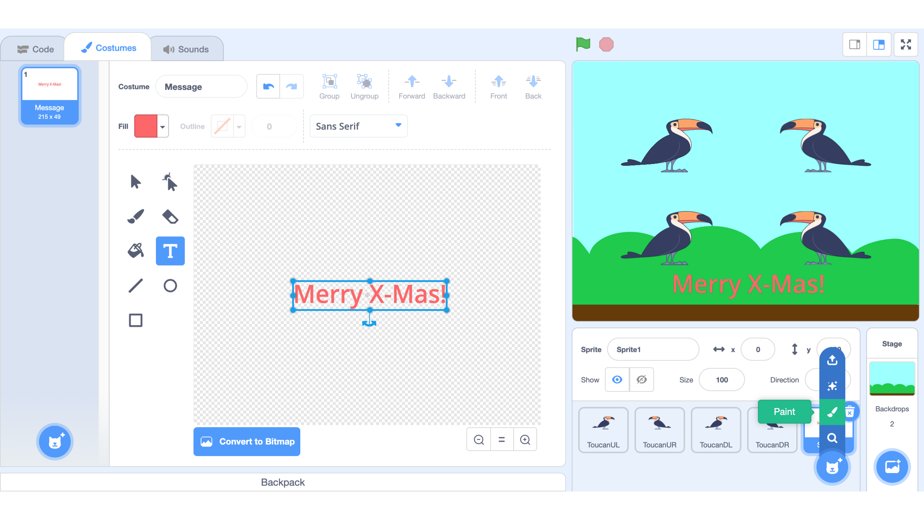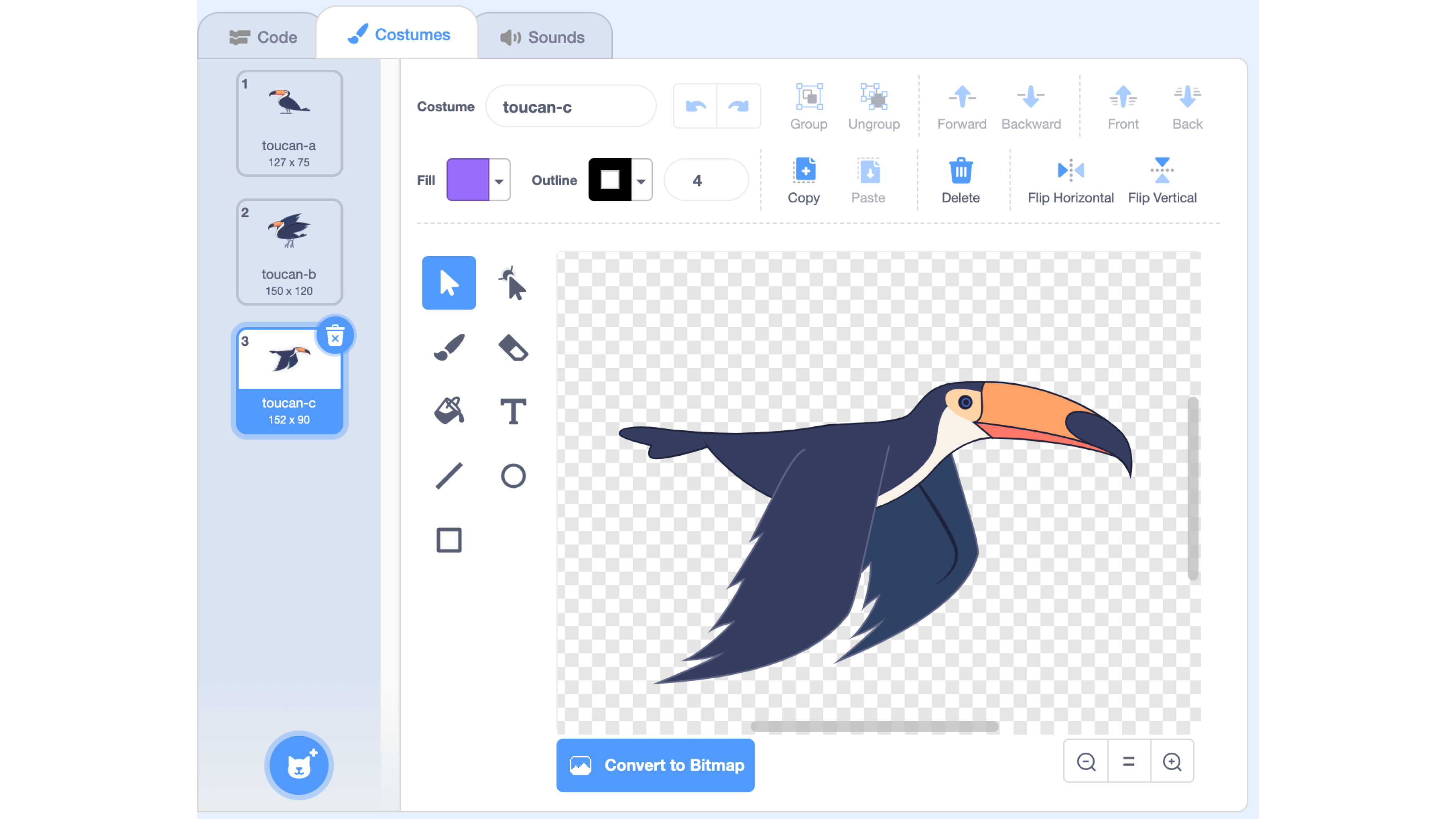 The toucan sprite comes with 3 “costumes”, aptly named “toucan-a”, “toucan-b” and “toucan-c”, as shown in the images.