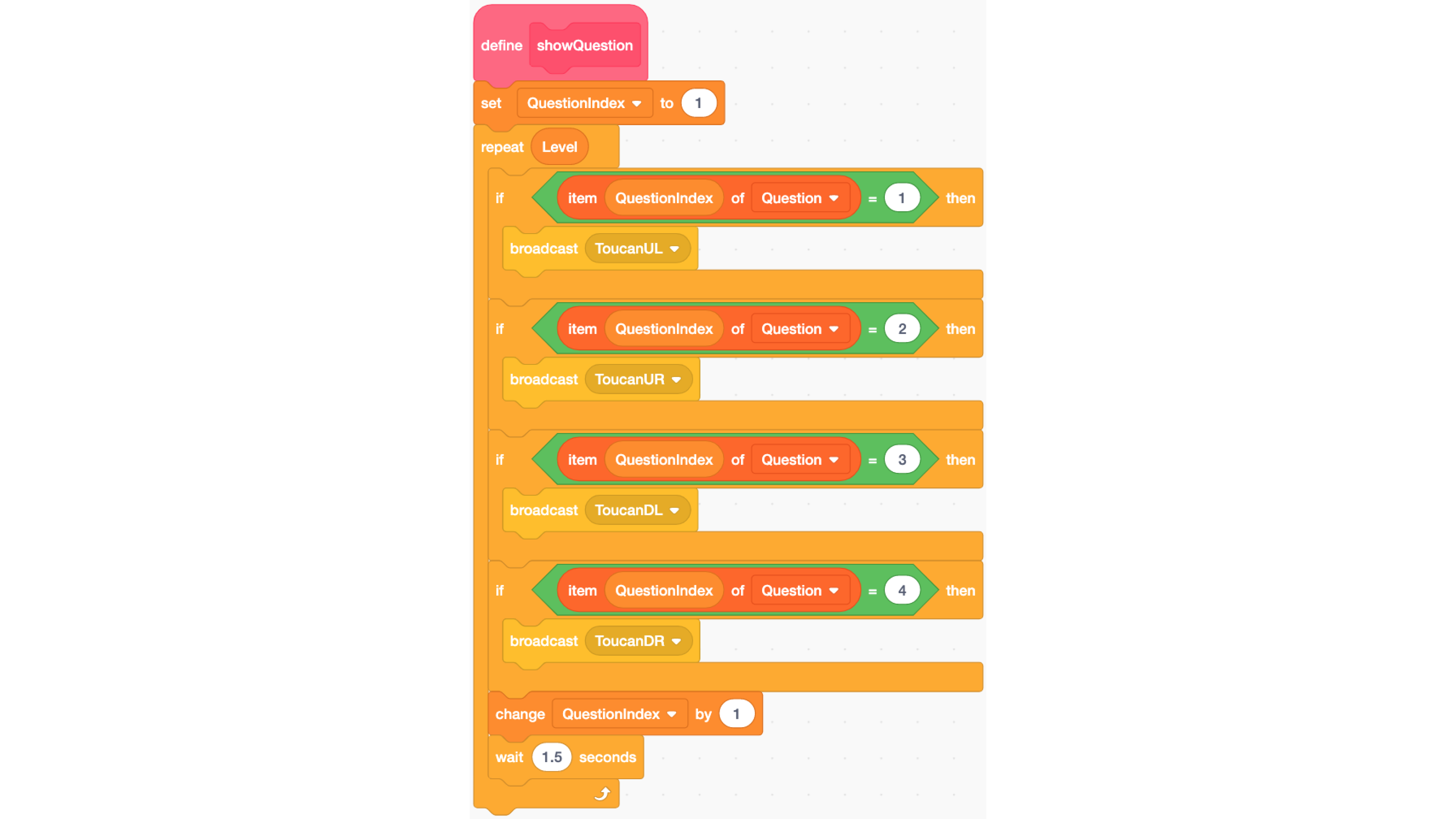 Next, we will create a block “showQuestion” that will translate the random numbers in the list “Question” into the random flapping of toucan wings. Here, a new variable “QuestionIndex” will keep track of the question number we are on. For every round, we will check the random number (1, 2, 3 or 4) that is stored in the list “Question” for that question. Each unique number will give a unique set of instructions to the toucans (via a broadcast). After each round, QuestionIndex will increase by 1, and there will be a 1.5s pause.