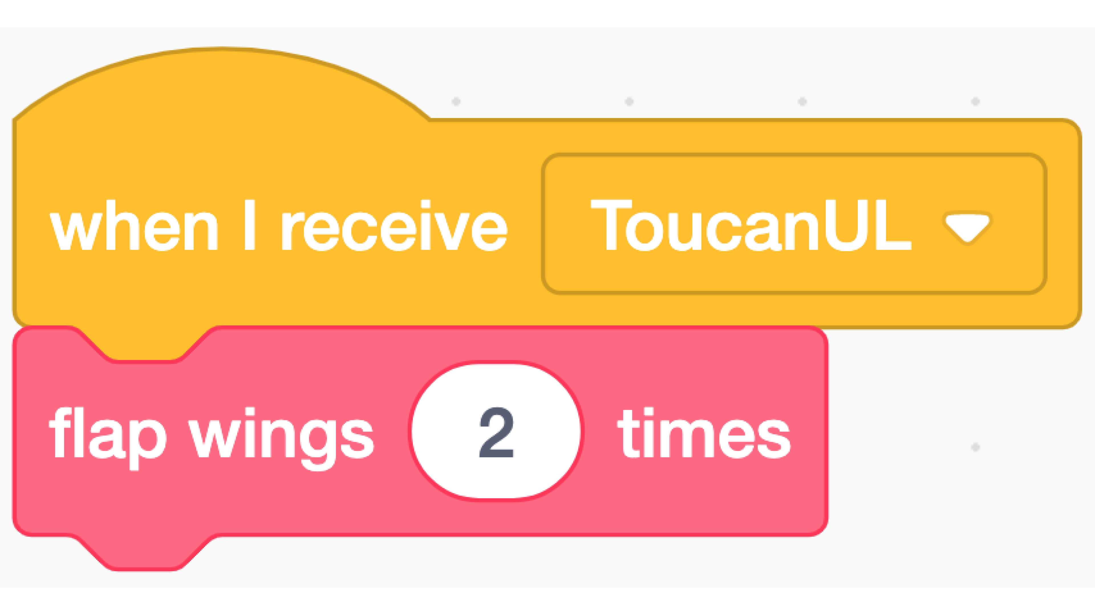 To signal the end of the game, all the toucans will flap their wings. To do this, add these blocks to all of the toucan sprites.