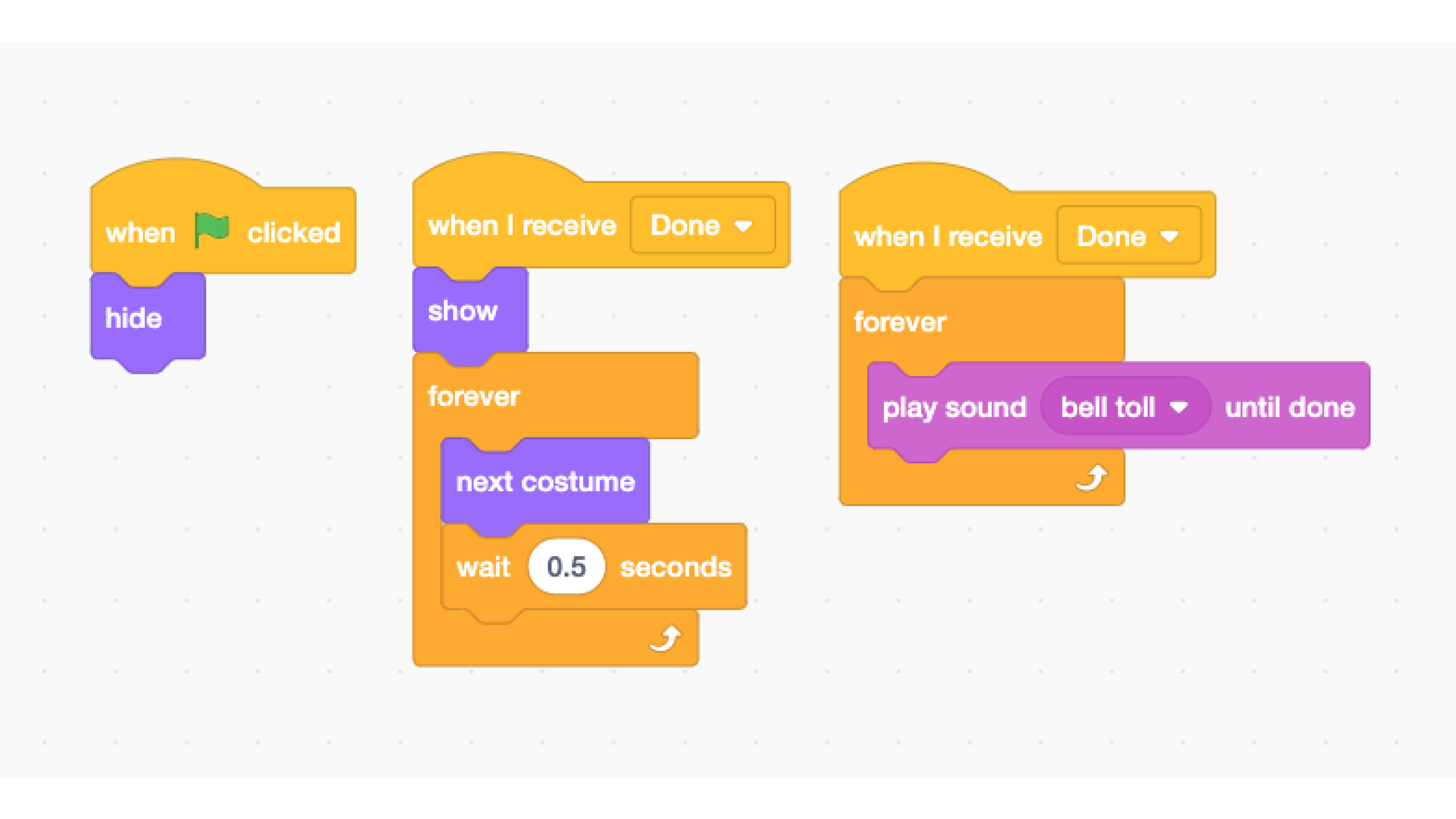 Add the following block to animate the bell sprite and make it ring. You’ll have to add a second costume for the bell by duplicating the first costume and flipping it horizontally. You may also need to shift the costume around slightly for the bell to animate nicely.