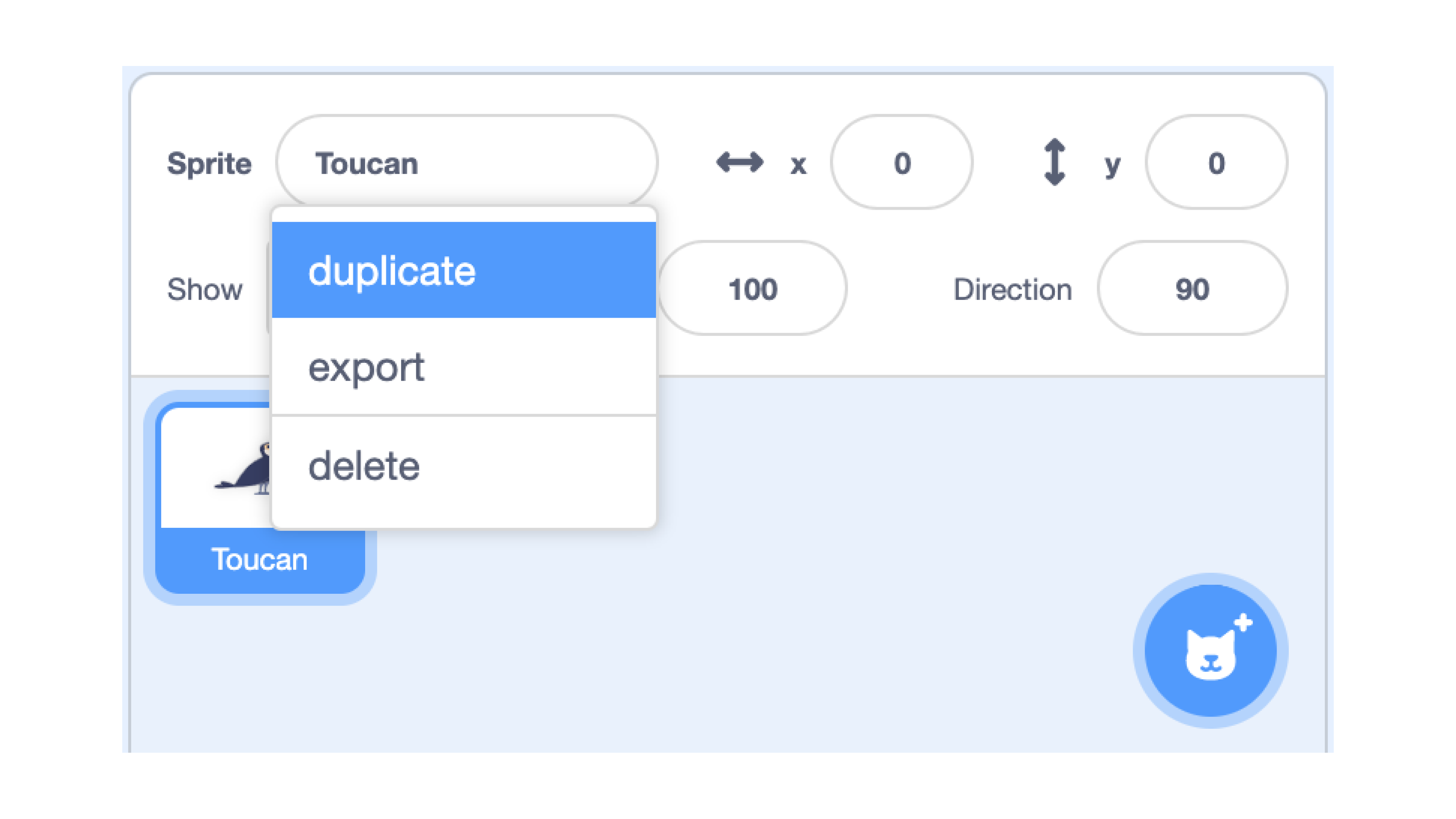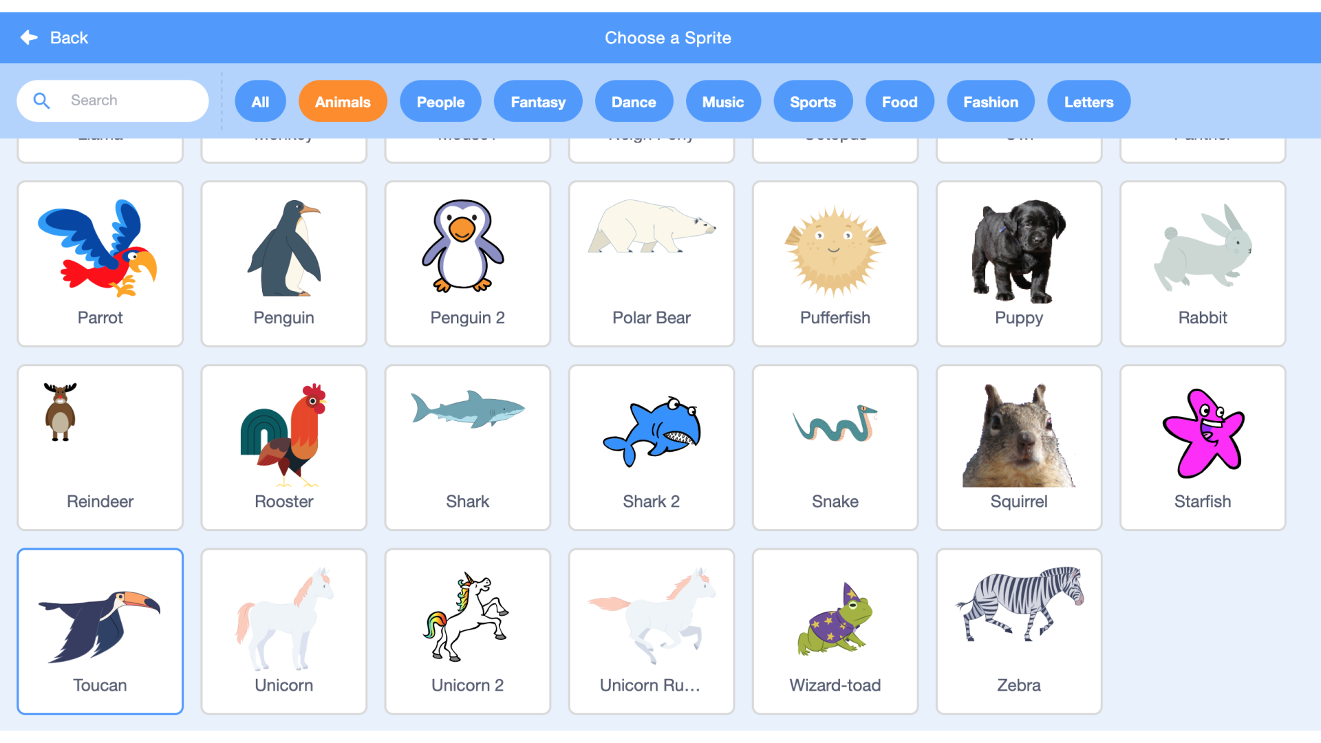 Under the sprite tab near the bottom right, add a Toucan sprite from the Scratch gallery.