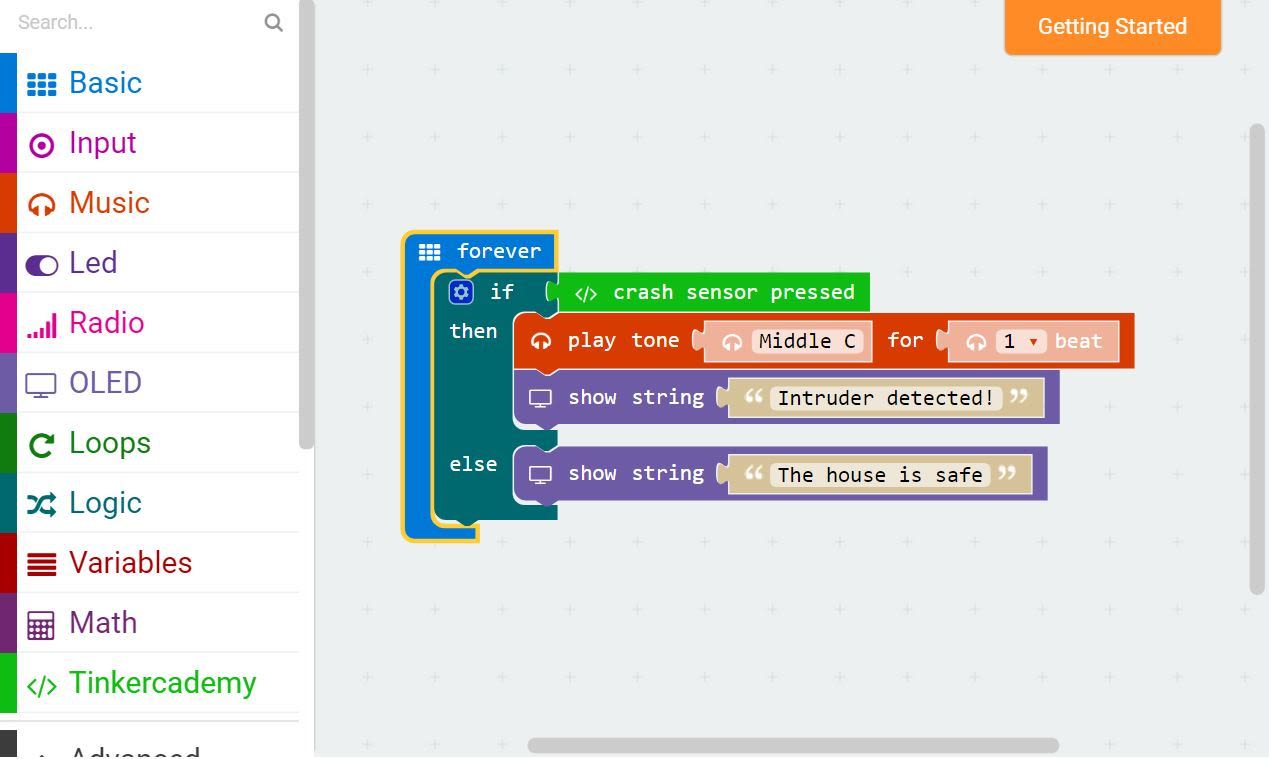 Follow the code in the picture. Basically, when the Crash Sensor is pressed, the Buzzer will sound and the OLED will show "Intruder detected". When the Crash Sensor is released, or in it's normal state, the OLED will display "The house is safe" and the Buzzer will be silent.