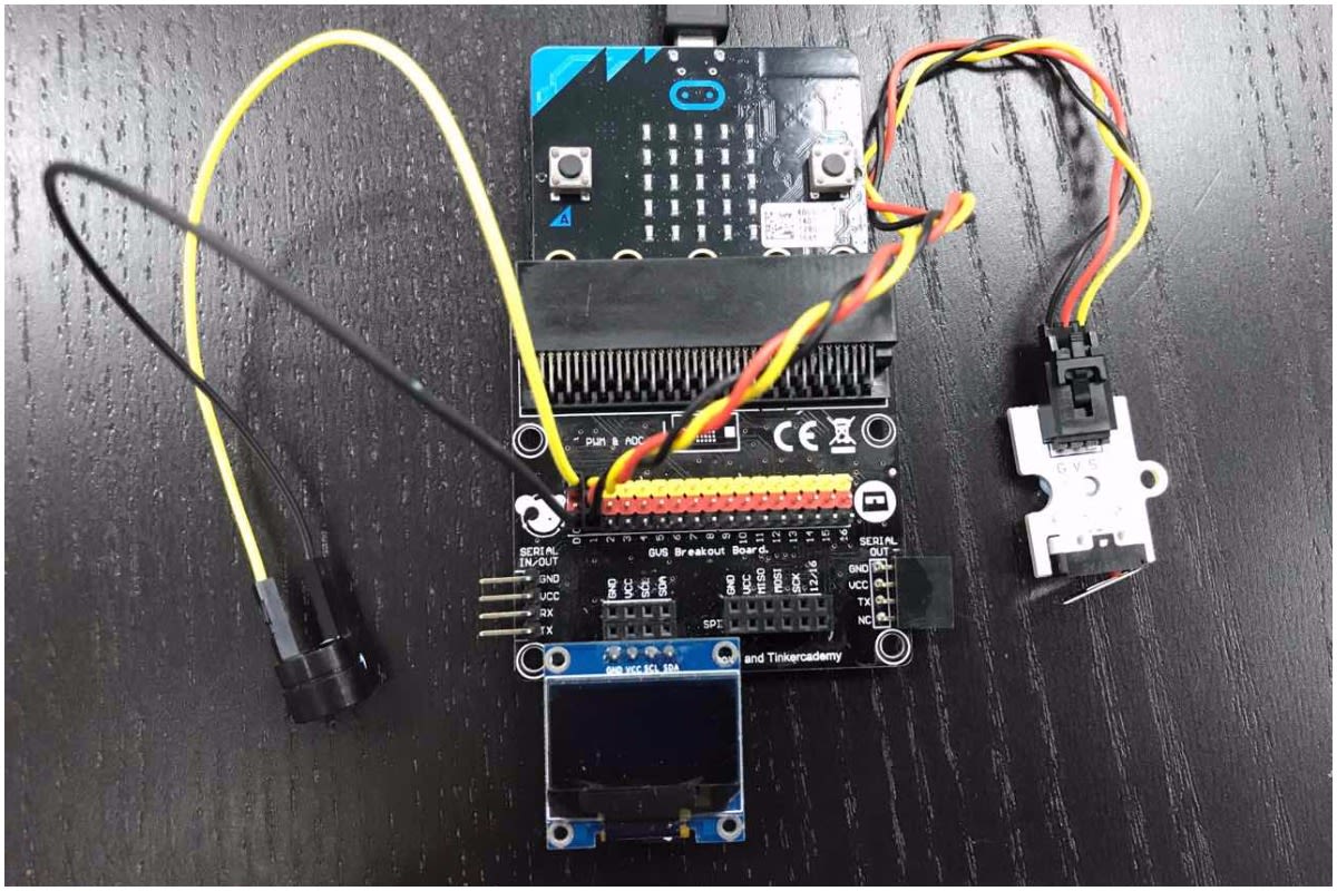 Plug in the OLED into the place on the Breakout Board as shown in the picture. Then connect the Crash Sensor to pin 1 of the Breakout Board, making sure the colours of the wires match the pins.