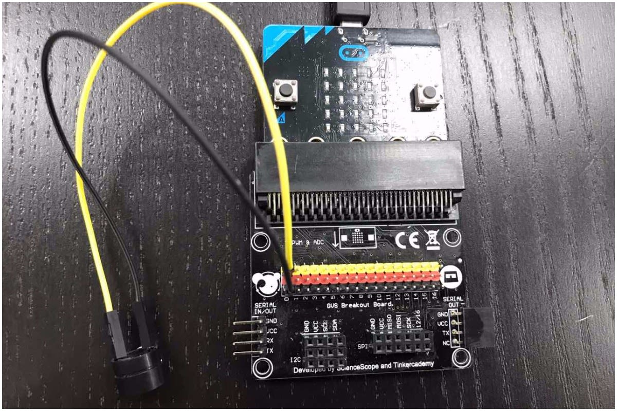 Insert the Micro:bit into the Breakout Board and then plug in the Micro USB Cable. Connect the Buzzer to pin 0 on the Breakout Board, connecting the positive leg of the Buzzer (usually longer) to the yellow pin on the Breakout Board and the negative leg of the Buzzer (usually shorter) to the black pin on the Breakout Board.