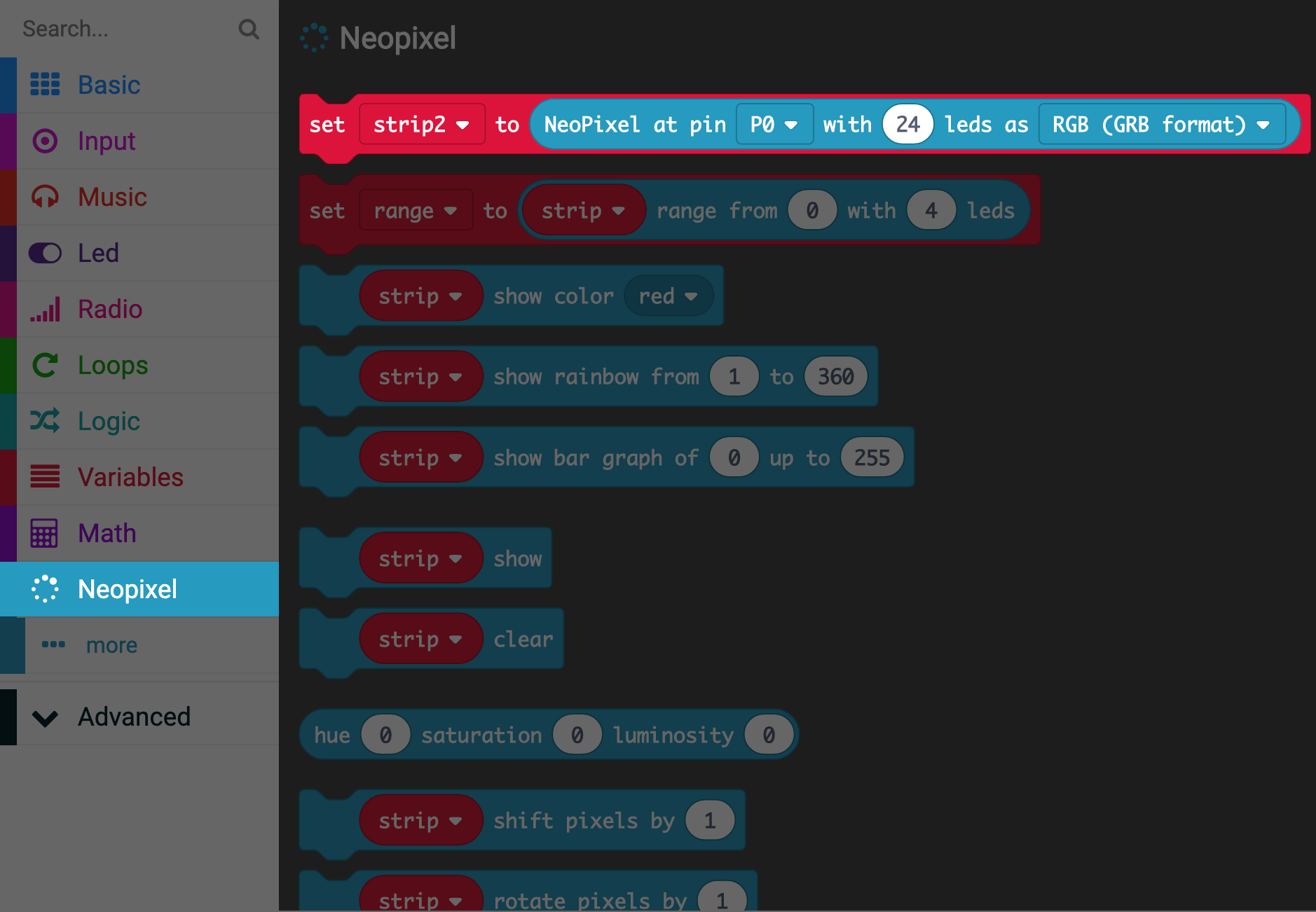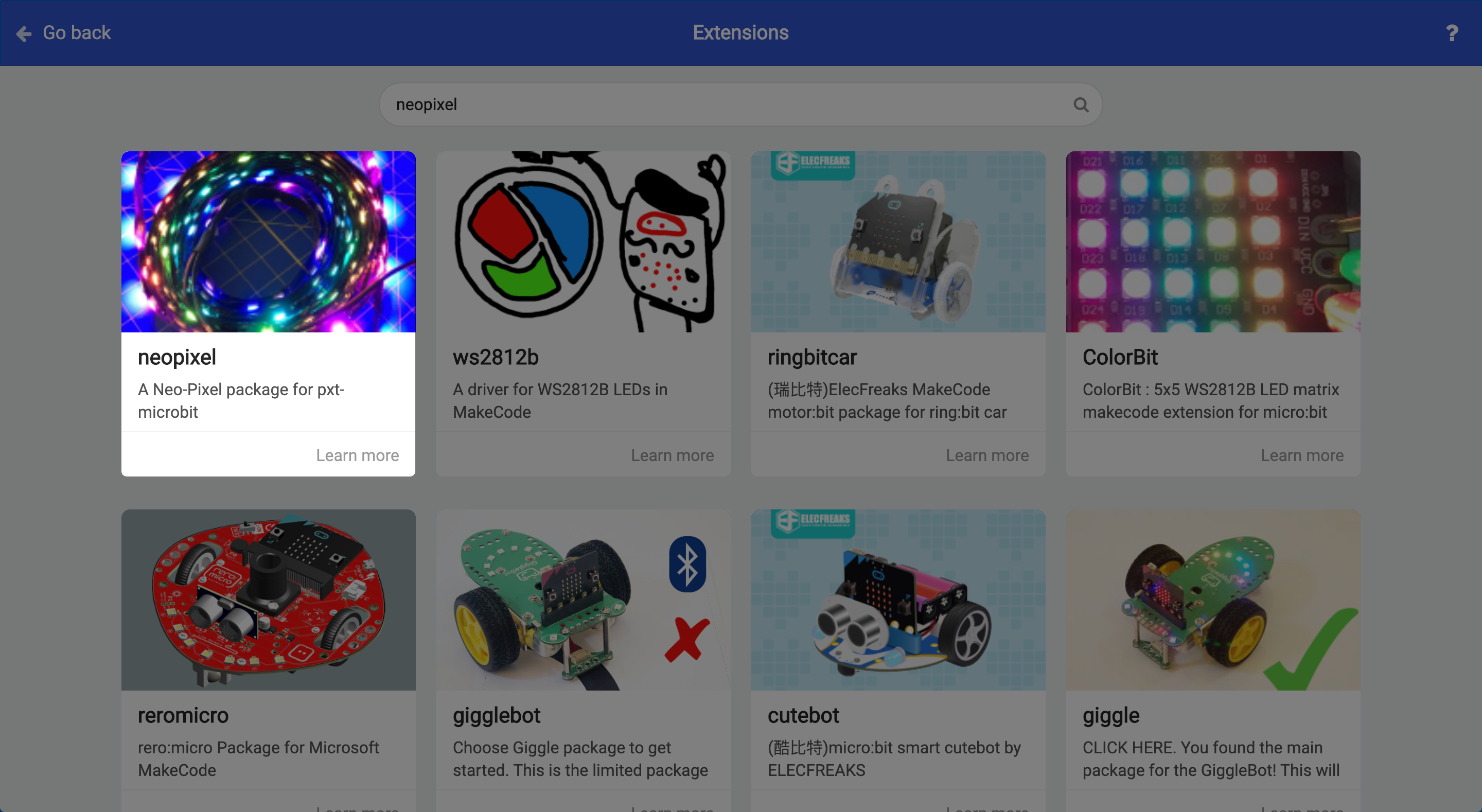 To connect a neopixel LED strip, we need to import a special package in MakeCode.