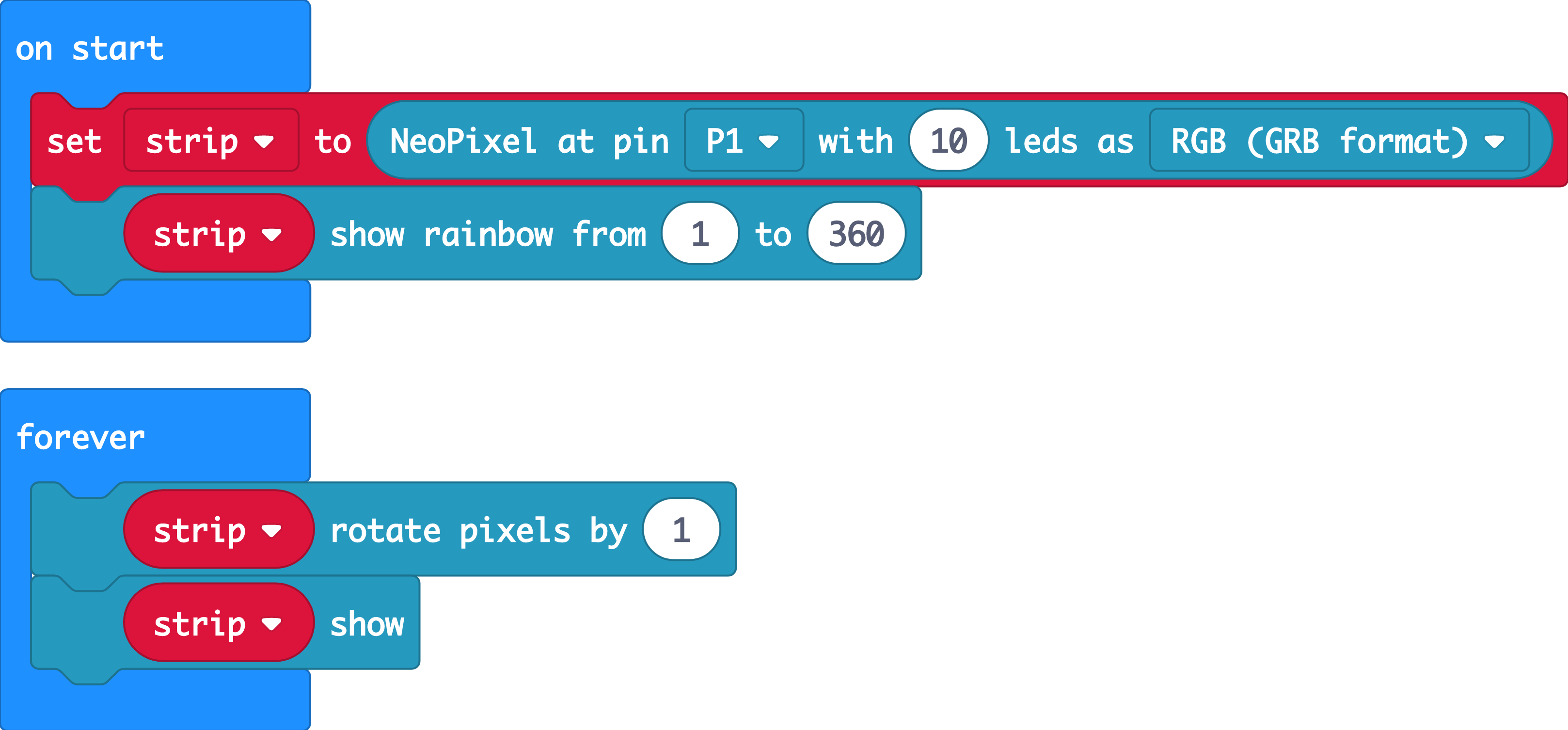 (b) To make the colors rotate, in a forever block, drag a 'strip rotate pixel' and a 'strip show' block.