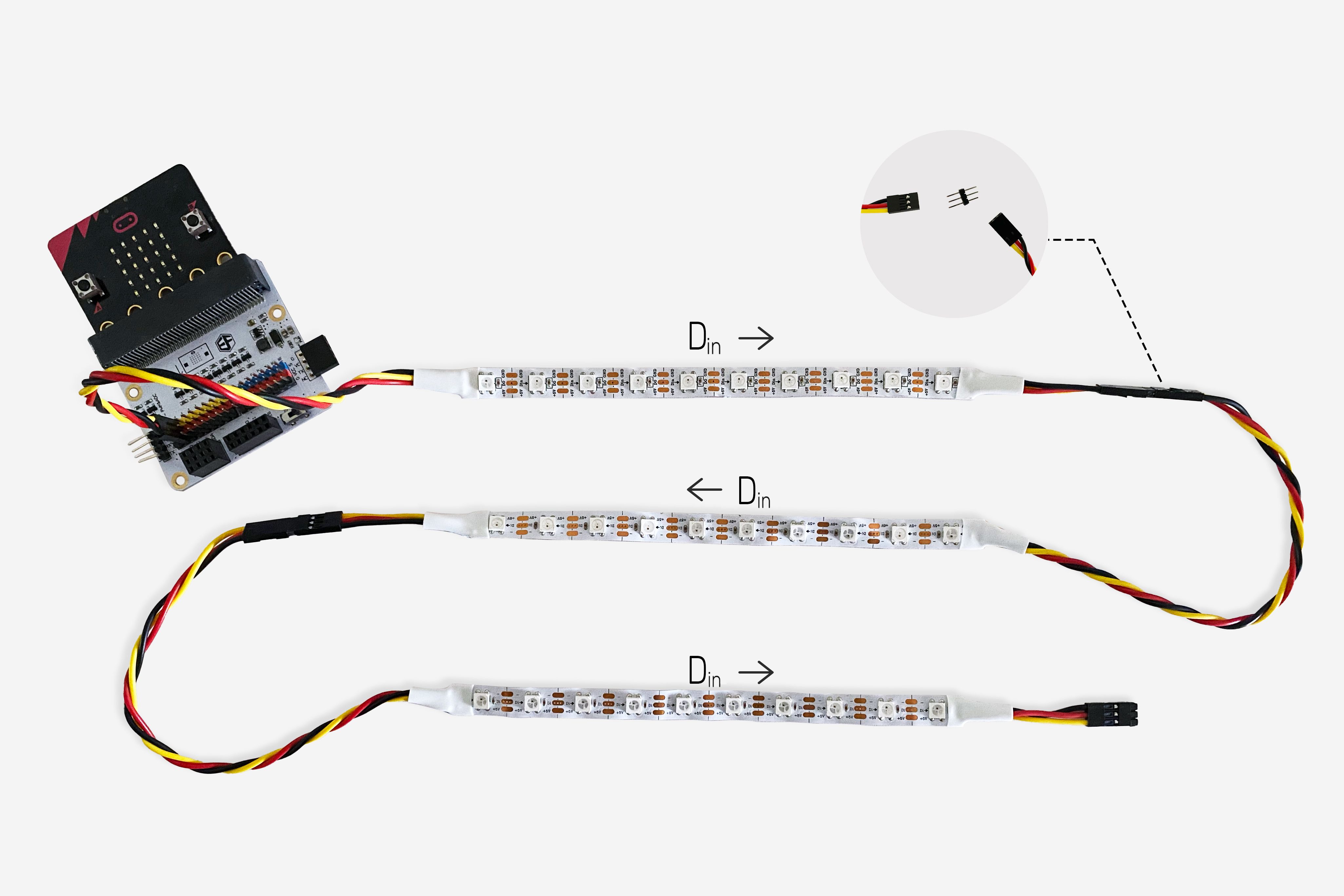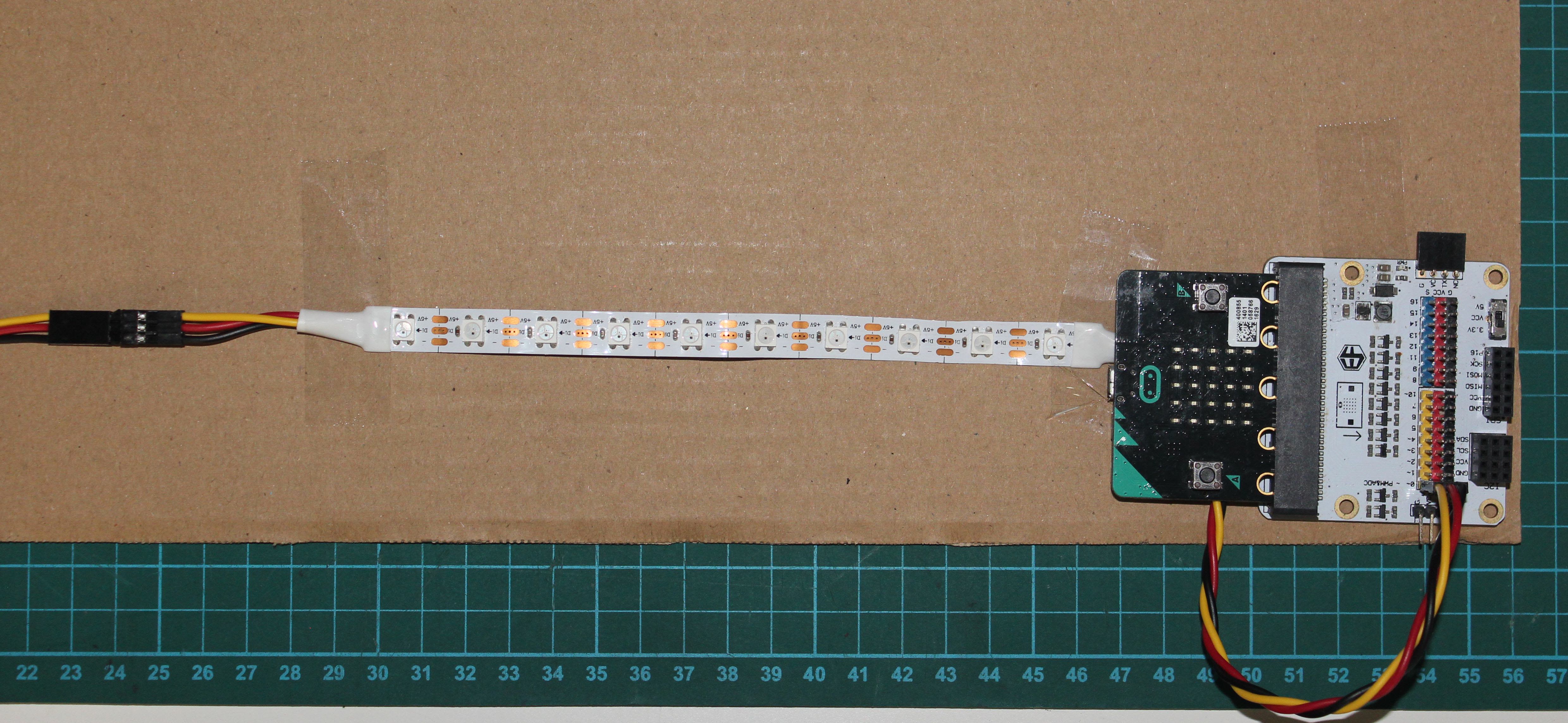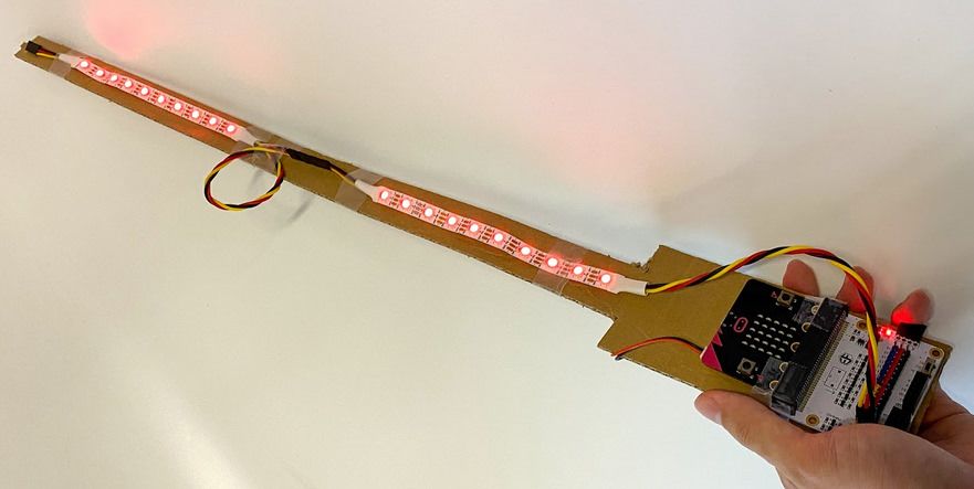 Cut out a cardboard base and secure your micro:bit (with breakout board) and LED strips to it with sticky tape or Blu Tack. You can get creative and shape your blade however you’d like. One of the nice things about these LED strips is that they are chainable! We chose a standard shape, but decided to use 2 LED strips chained together to make our lightsaber a bit longer.