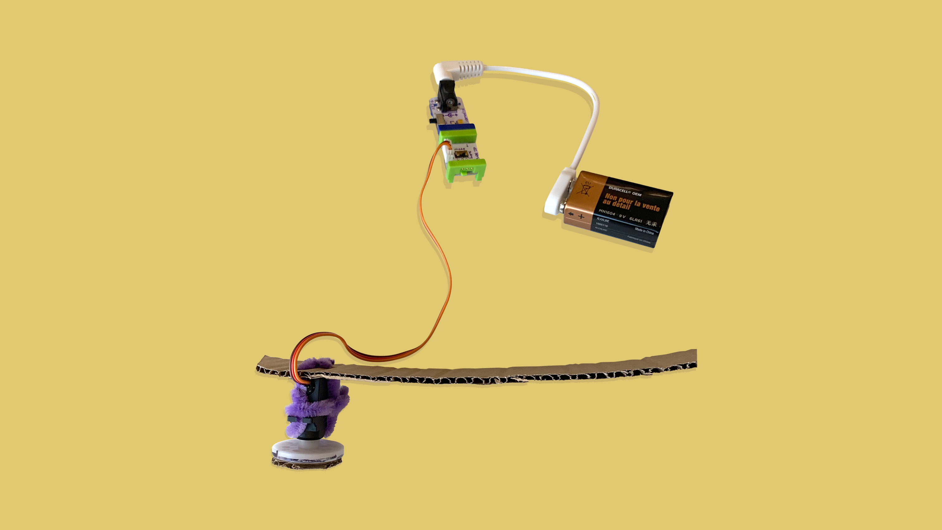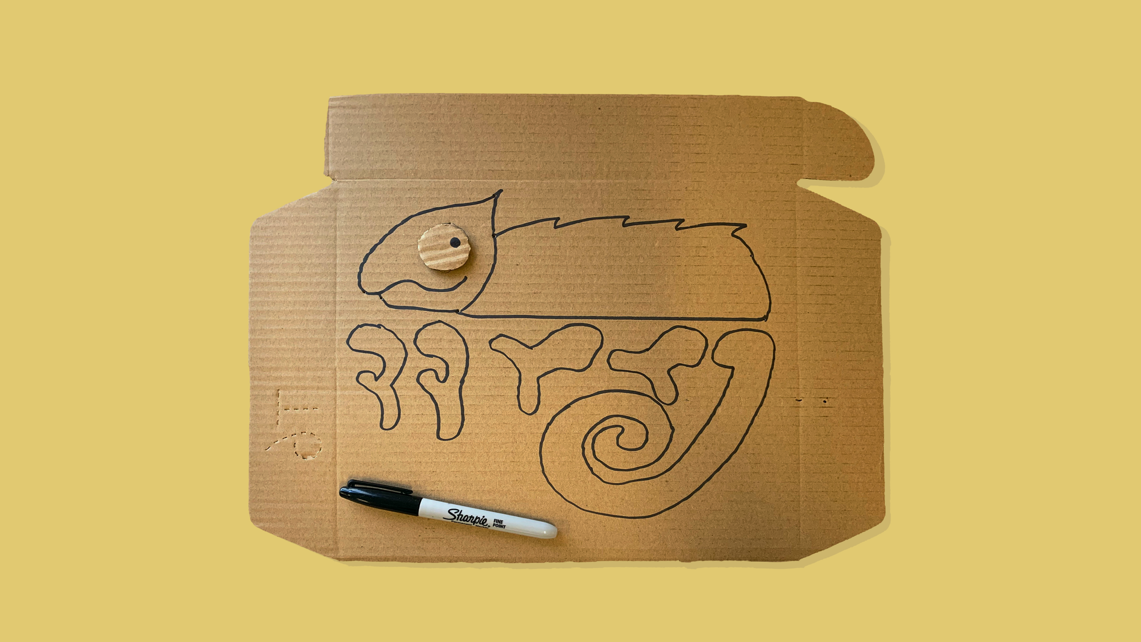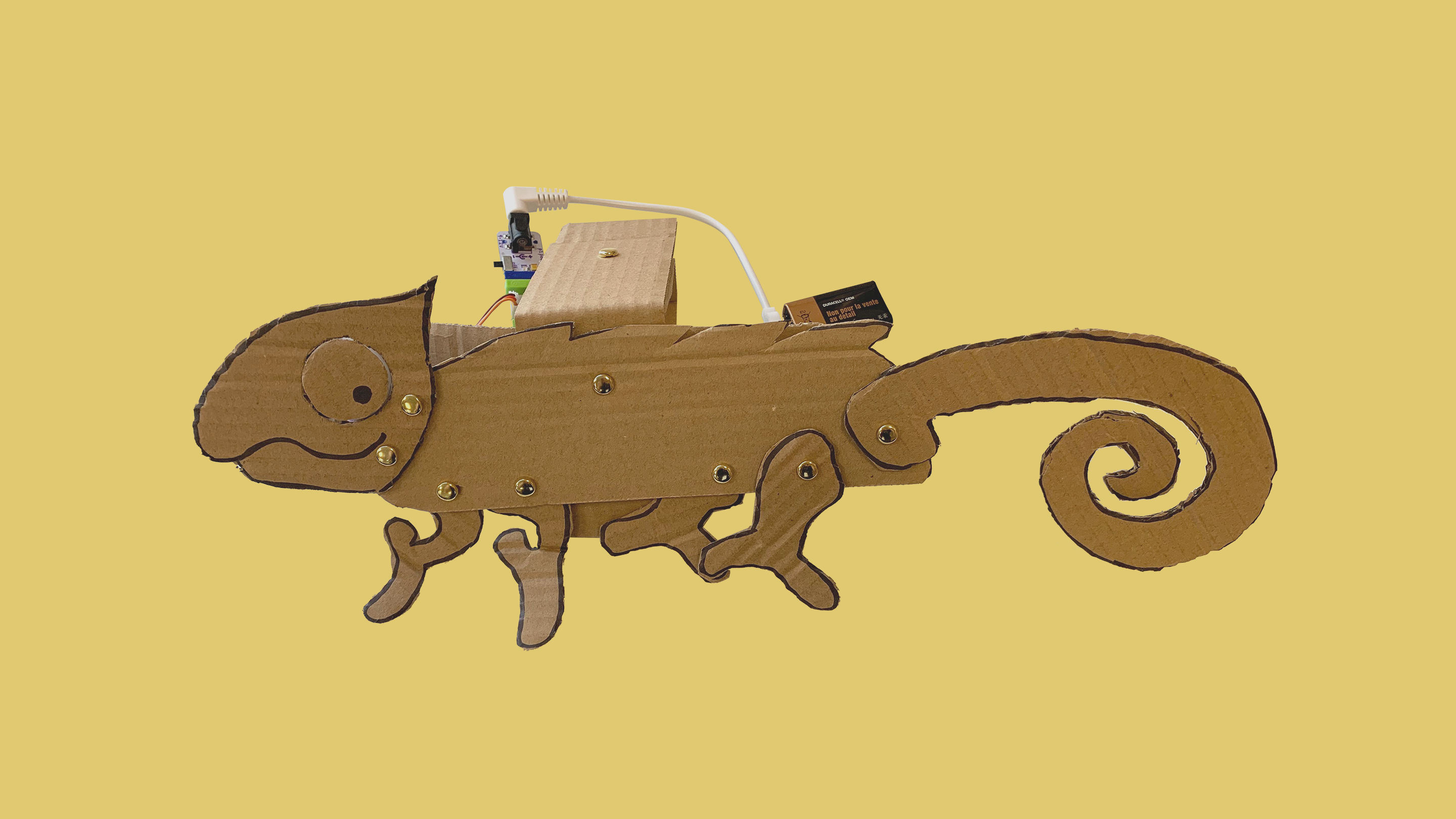 Create a cardboard chameleon with rotating eyes and blow out tongue with littleBits
