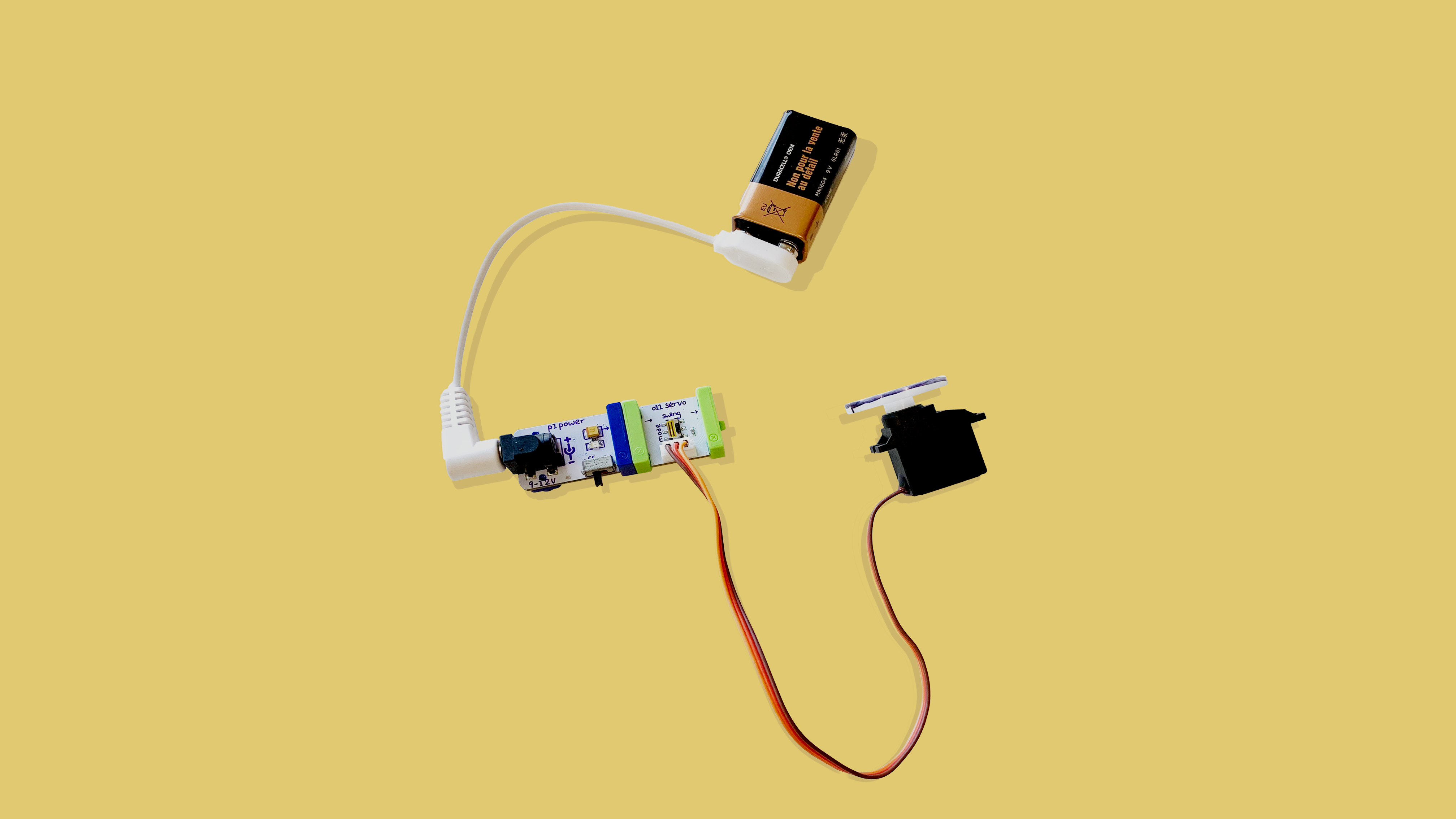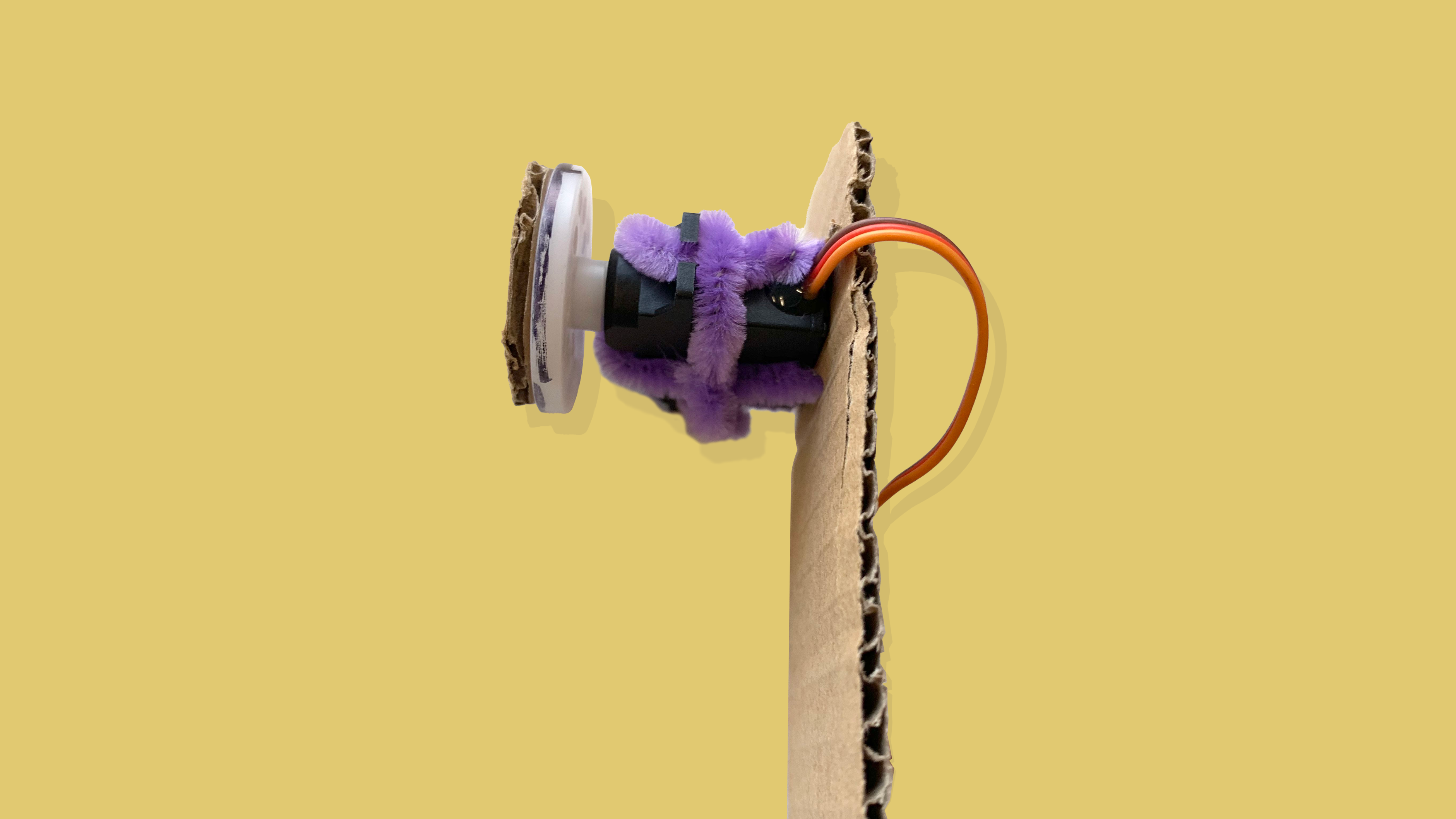 Attach the servo to cardboard strip as shown (poke holes in cardboard strip with paper fastener, poke pipecleaner through and tie around servo).