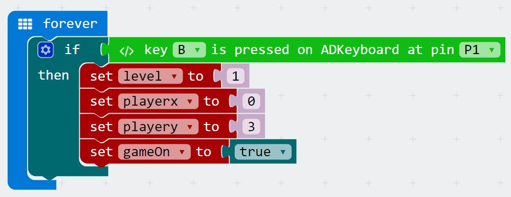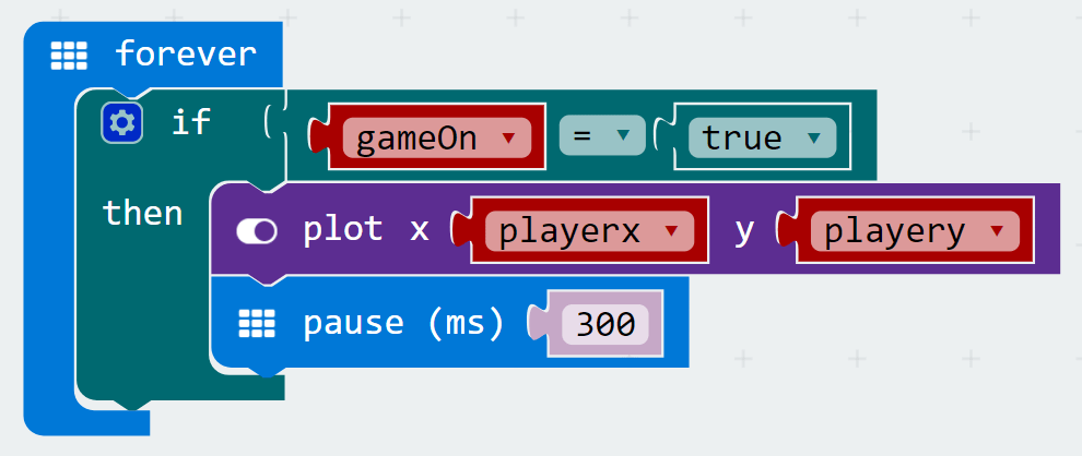 After that, add these blocks under the "forever" block. We want to make the player dot blink so that we can tell where the player is. The 'if' checks if "gameOn" is true, then the "plot x y" block lights up the LED where the player is, based on "playerX" and "playerY". The blinking won't start if you run it now, but in a later step when we draw the level, every time the level is drawn the player dot disappears, so the wait block creates the blinking effect when the "plot" block redraws the player dot. You can change the number on wait to change the speed it blinks as well.