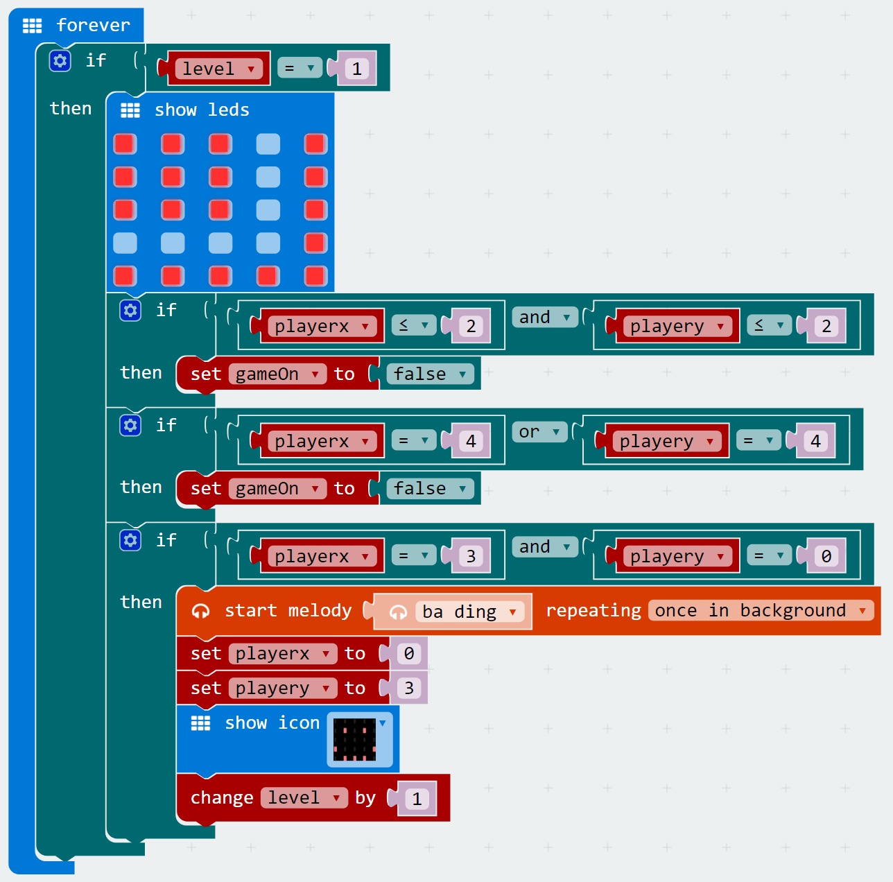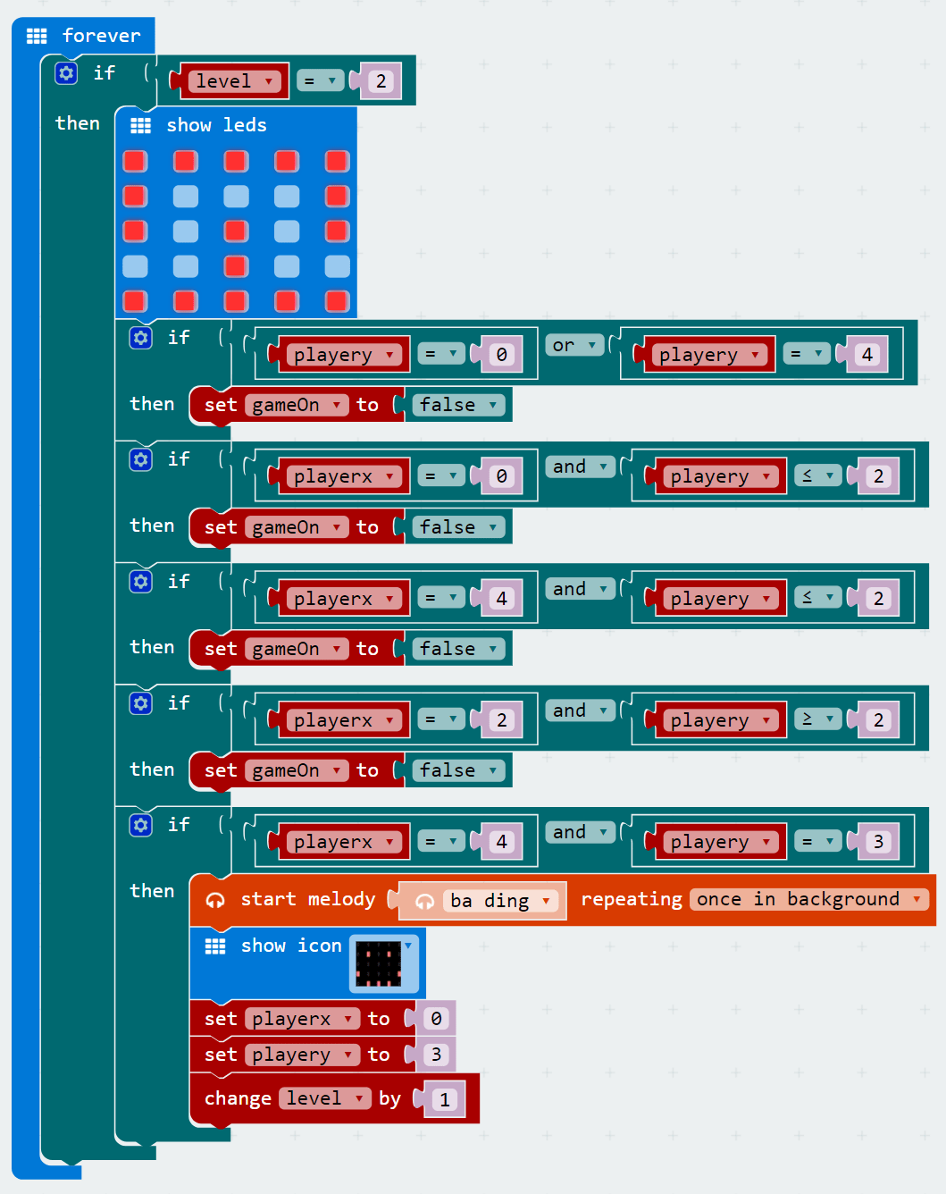 Add another forever block and follow the code in the picture. This portion of the code determines the layout of level 1, as well as creates the win and lose parameters of the level.