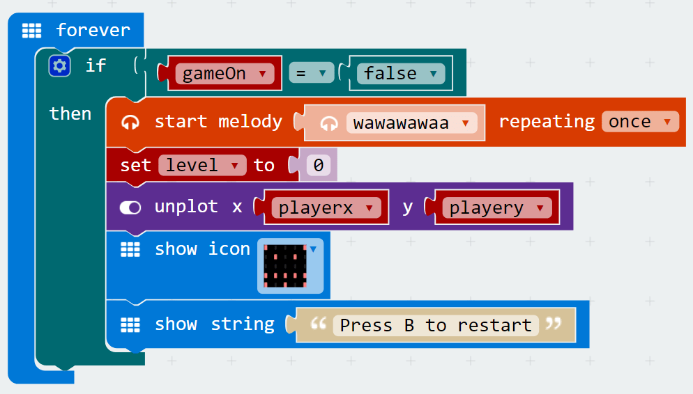 Next we will code what happens when you lose a level. Make yet another forever loop and follow the code in the picture. In this portion, it checks if "gameOn" is false, which happens when you touch a "wall" as seen in the last step, then it plays a melody, resets the "level", removes the player dot, then shows an angry face and "Press B to restart".