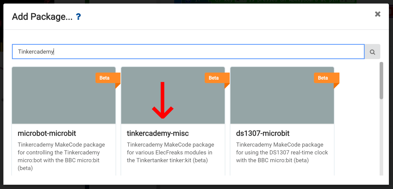 Scroll down the packages tab to "Add Packages" and click on it. Then type "Tinkercademy" in the search box and select the one shown in the picture. It should start installing the packages. The bright green package has blocks that enable the Micro:bit to sense inputs from the ADKeypad.