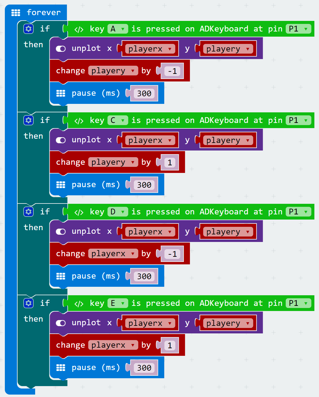 Now that you have the Tinkercademy package, add another "forever" block. Then follow the code in the picture. Increasing "playerY" moves the player dot down and decreasing it moves the player dot up. Increasing "playerX" moves the player dot right and decreasing it moves the player dot left. The pauses added are to make sure the player dot doesn't move more than once in one press.