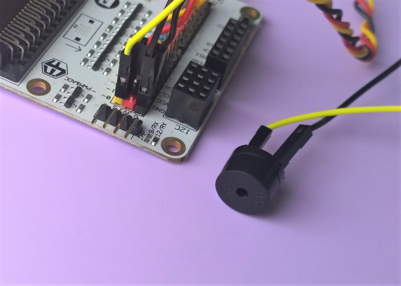Connect the Buzzer to pin 0 of the Breakout Board, connecting the yellow signal pin to the positive leg of the buzzer and the black ground pin to the negative leg of the Buzzer. Then connect the ADKeypad to pin 1 of the Breakout Board, matching the colours of the wires to the colours of the pins.