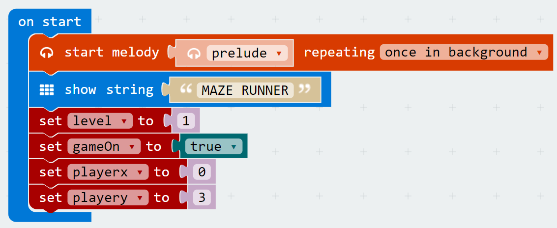 Go into the Block Editor at makecode.microbit.org and follow the code in the picture. This code shows what happens when you first turn on the Micro:bit. It will play the music and display the word "MAZE RUNNER". Then it will set up all the variables. These variables can be created in the variables tab. "level" refers to what level the game is on, "gameOn" determines if the game continues or not and "playerX" and "playerY" represent where the player dot starts on the screen. You can change the "playerX" and "playerY" variables to your liking, just remember to design the level accordingly later so the player doesn't start in a wall.