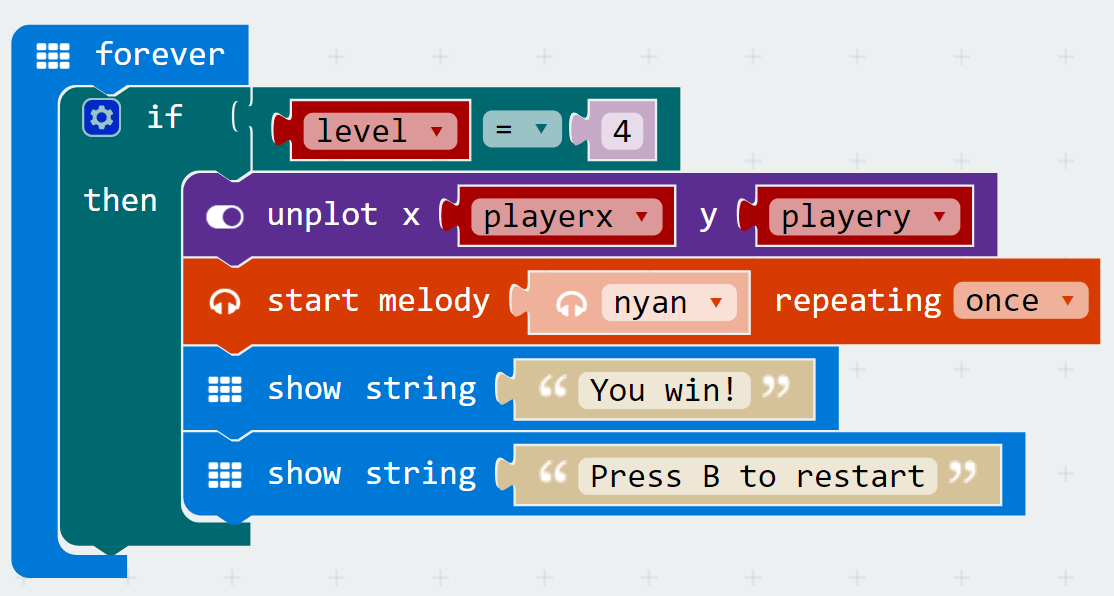 Once you're done adding as many levels as you like, create the code you see in the picture. This is the "win" once the player has completed all the levels. Remember that the "level" in the if block must always be +1 of the last "level". (in the picture there are 3 levels so the "level" = 4 in the if block)