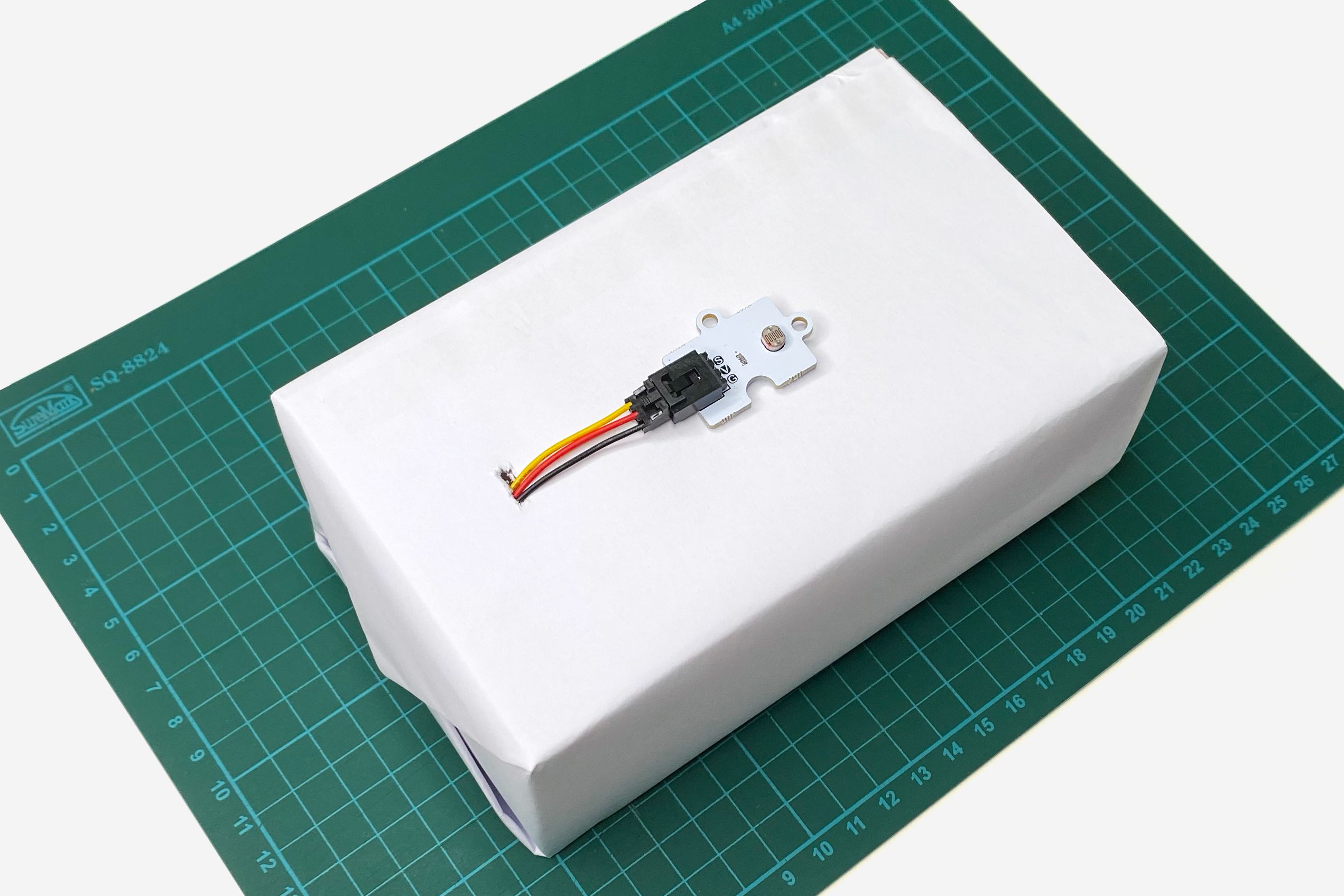 Now thread the three-coloured GVS wires of the light sensor through the hole so that the sensor is on the outside of the box.