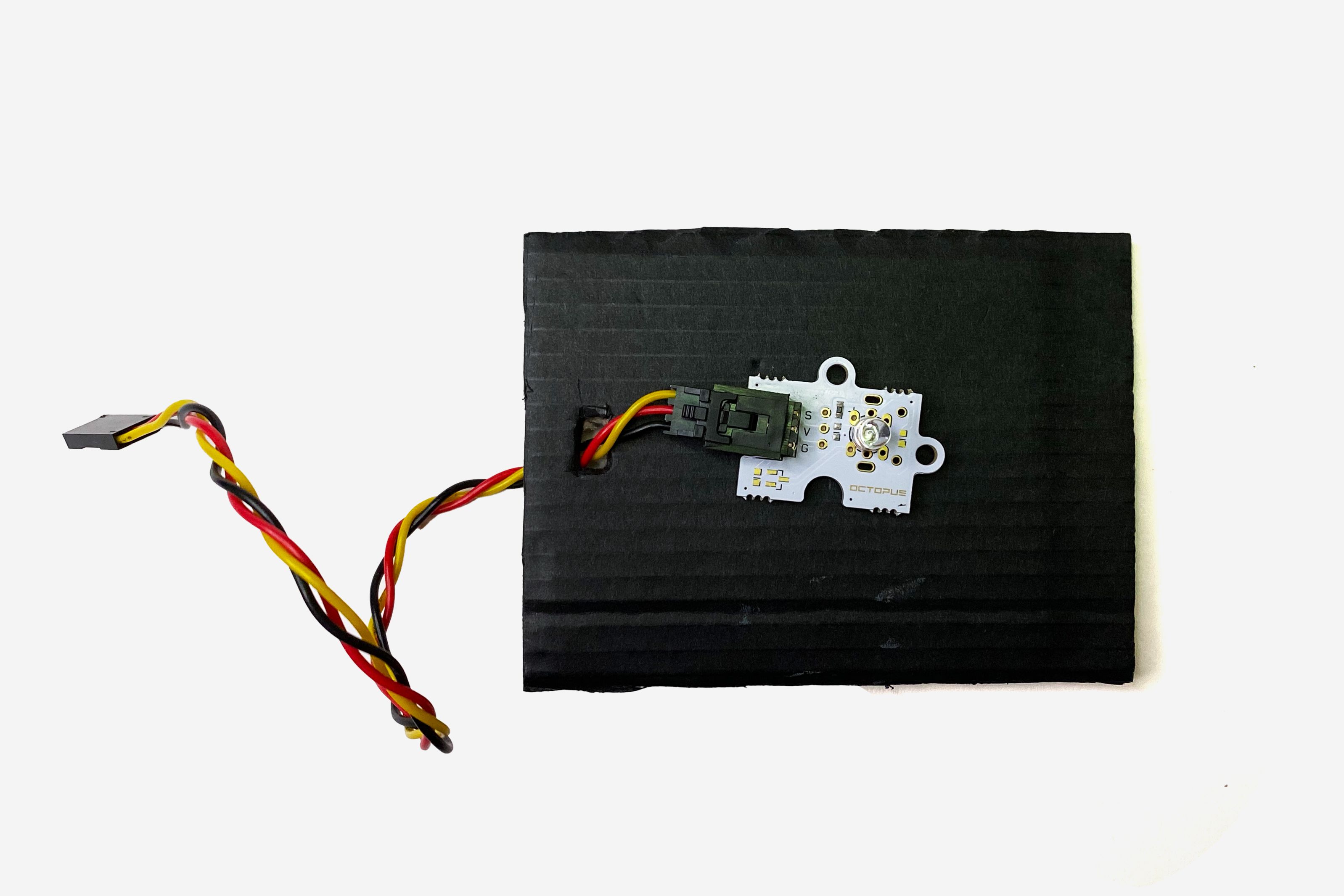 Thread the three-coloured GVS wires of the LED through the hole you cut in the last step!