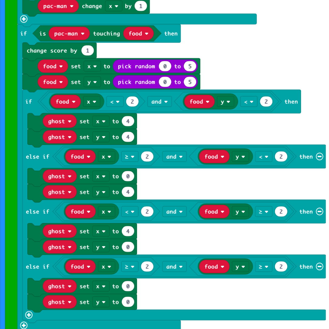 (b) We can do so by dividing the 25 LEDs on the micro:bit into 4 different quadrants. If the food is generated in the top left quadrant, the ghost will be positioned at the bottom right LED. If-else statements can be used to execute this.