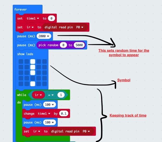 In a new ‘forever’ block, write these code down. Make a new variable named ‘ir’. This will read the readings by IR Receiver. The pauses are to ensure the symbol(in this case, exclamation mark) appears randomly. The loop(green block) is to start counting the time until signal has been received by the IR Transmitter(Remote).