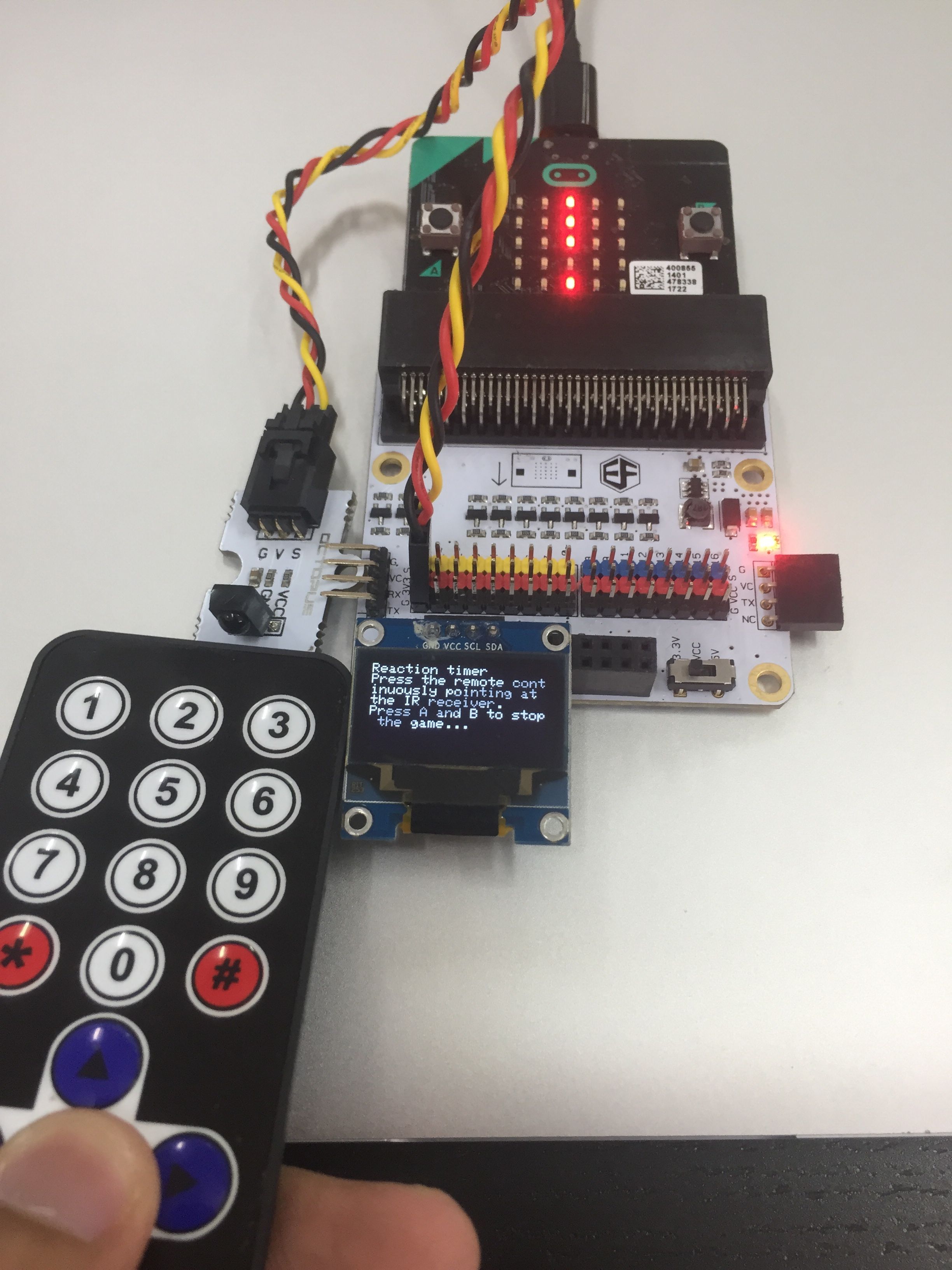 And you are done! You can now see how fast you are. To see the average on the OLED screen, you can press A and B. Remember to press the IR transmitter directly in front of the IR receiver. Enjoy!