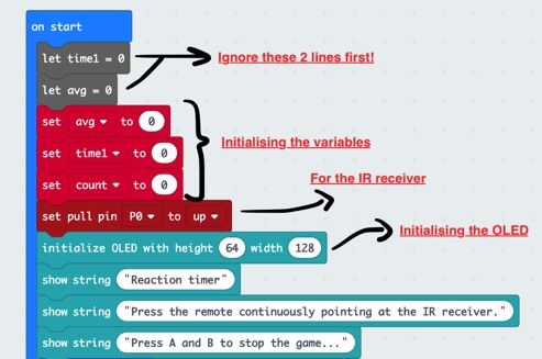 Now let’s start coding! Ignore the first 2 lines. Make 3 new variables named ‘avg’, ‘time1’ and ‘count’. Initialise them by setting them to 0. Go to ‘Pins’, look for the block ‘set pull pin P0 to up’ and place it below the variables. This is to tell the micro:bit that there is an IR Receiver. Lastly, initialise the OLED and show the instructions of how this device works.