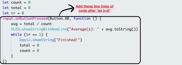 In JavaScript, add in these lines of code after ‘let ir=0’. Once again, these few lines of code could be done by using the blocks but the 3rd line of code requires you to change ‘avg’ from integer to string, thus you need JavaScript. You can switch over to the blocks to understand the code you have written.