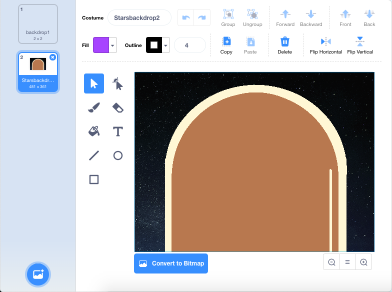 Hover over the cat icon in the bottom right hand corner and click the paintbrush that appears for Paint. Draw each of the different components of your pinball board as different sprites, and position them accordingly on the display screen. Some examples of components include flippers, bumpers, barriers, etc. These will all be coded differently, so do make sure they’re separate sprites. Don’t forget the ball!