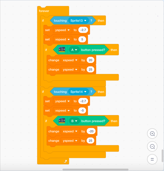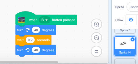 Make sure your flipper sprite is drawn such that the point of rotation is aligned with the small grey target icon in Paint. Select each of the sprites and code the movement of the two flippers when the micro:bit buttons A and B are pressed.