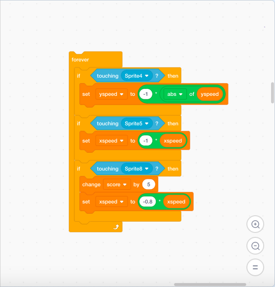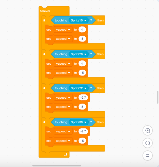 If you’ve been testing your game throughout, you may have noticed that the ball tends to fly out of the boundaries you’ve created even though the code looks perfectly fine. This is because Scratch may not register that the ball sprite is touching another sprite as the ball is moving too fast.