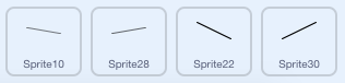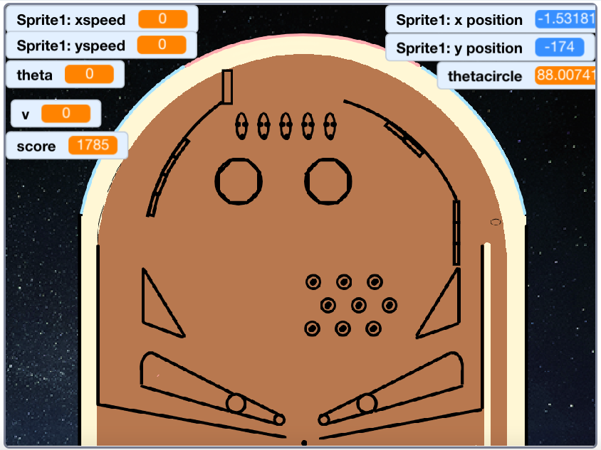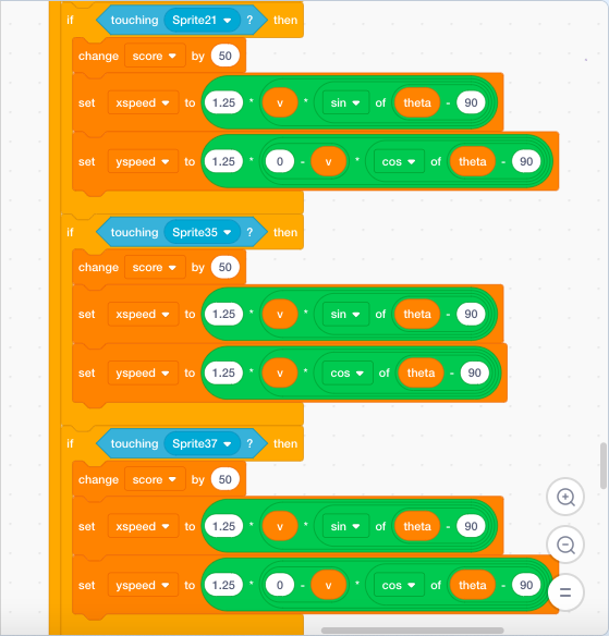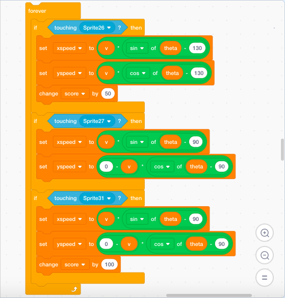 Similarly, use trigonometry to determine the approximate angle of the slopes and the angle at which the ball should bounce off and travel in. For diagonally-placed point targets (e.g. Sprite26 and Sprite31), increase score as desired when the ball sprite touches the point target.