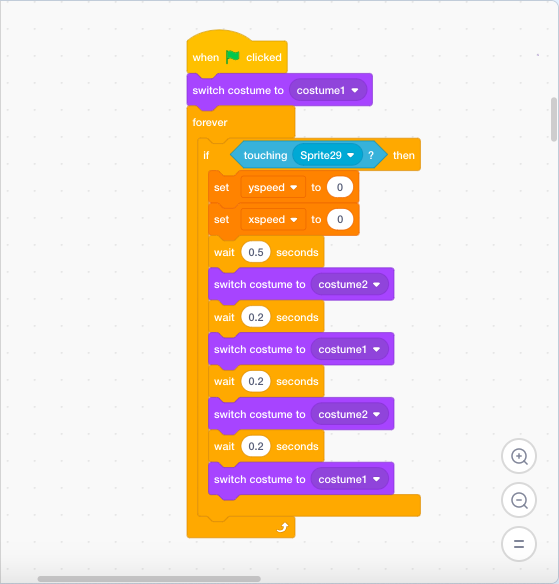 Click on Costumes under the ball sprite and create a blank costume (costume2). This code causes the ball to flash when the ball touches the sprite, indicating that the game is over.